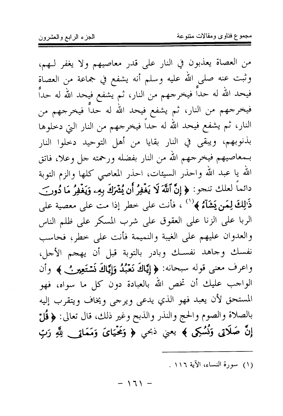 من العصاة يعذبون في النار على قدر معاصيهم ولا يغفر لهم، وثبت عنه صلى الله عليه وسلم أنه يشفع في جماعة من العصاة فيحد الله له حدا فيخرجهم من النار، ثم يشفع فيحد الله له حدا فيخرجهم من النار، ثم يشفع فيحد الله له حدا فيخرجهم من النار، ثم يشفع فيحد الله له حدا فيخرجهم من النار التي دخلوها بذنوبهم، ويبقى في النار بقايا من أهل التوحيد دخلوا النار بمعاصيهم فيخرجهم الله من النار بفضله ورحمته جل وعلا، فاتق الله يا عبد الله واحذر السيئات، احذر المعاصي كلها والزم التوبة دائما لعلك تنجو: {إِنَّ اللَّهَ لَا يَغْفِرُ أَنْ يُشْرَكَ بِهِ وَيَغْفِرُ مَا دُونَ ذَلِكَ لِمَنْ يَشَاءُ} (¬1) فأنت على خطر إذا مت على معصية على الربا على الزنا على العقوق على شرب المسكر على ظلم الناس والعدوان عليهم على الغيبة والنميمة فأنت على خطر، فحاسب نفسك وجاهد نفسك وبادر بالتوبة قبل أن يهجم الأجل، واعرف معنى قوله سبحانه: {إِيَّاكَ نَعْبُدُ وَإِيَّاكَ نَسْتَعِينُ} (¬2) وأن الواجب عليك أن تخص الله بالعبادة دون كل ما سواه، فهو المستحق لأن يعبد فهو الذي يدعى ويرجى ويخاف ويتقرب إليه بالصلاة والصوم والحج والنذر والذبح وغير ذلك، قال تعالى: {قُلْ إِنَّ صَلَاتِي وَنُسُكِي} (¬3) يعني ذبحي