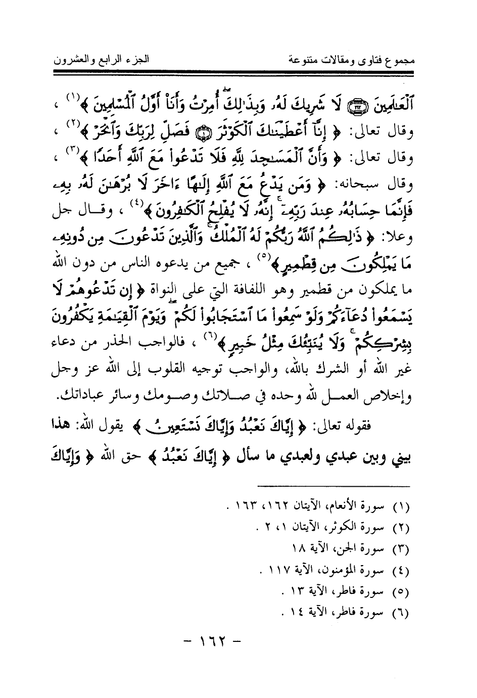 {وَمَحْيَايَ وَمَمَاتِي لِلَّهِ رَبِّ الْعَالَمِينَ} (¬1) {لَا شَرِيكَ لَهُ وَبِذَلِكَ أُمِرْتُ وَأَنَا أَوَّلُ الْمُسْلِمِينَ} (¬2) وقال تعالى: {إِنَّا أَعْطَيْنَاكَ الْكَوْثَرَ} (¬3) {فَصَلِّ لِرَبِّكَ وَانْحَرْ} (¬4) وقال تعالى: {وَأَنَّ الْمَسَاجِدَ لِلَّهِ فَلَا تَدْعُوا مَعَ اللَّهِ أَحَدًا} (¬5) وقال سبحانه: {وَمَنْ يَدْعُ مَعَ اللَّهِ إِلَهًا آخَرَ لَا بُرْهَانَ لَهُ بِهِ فَإِنَّمَا حِسَابُهُ عِنْدَ رَبِّهِ إِنَّهُ لَا يُفْلِحُ الْكَافِرُونَ} (¬6) وقال جل وعلا: {ذَلِكُمُ اللَّهُ رَبُّكُمْ لَهُ الْمُلْكُ وَالَّذِينَ تَدْعُونَ مِنْ دُونِهِ مَا يَمْلِكُونَ مِنْ قِطْمِيرٍ} (¬7) جميع من يدعوه الناس من دون الله ما يملكون من قطمير وهو اللفافة التي على النواة {إِنْ تَدْعُوهُمْ لَا يَسْمَعُوا دُعَاءَكُمْ وَلَوْ سَمِعُوا مَا اسْتَجَابُوا لَكُمْ وَيَوْمَ الْقِيَامَةِ يَكْفُرُونَ بِشِرْكِكُمْ وَلَا يُنَبِّئُكَ مِثْلُ خَبِيرٍ} (¬8) فالواجب الحذر من دعاء غير الله أو الشرك بالله، والواجب توجيه القلوب إلى الله عز وجل وإخلاص العمل لله وحده في صلاتك وصومك وسائر عباداتك.