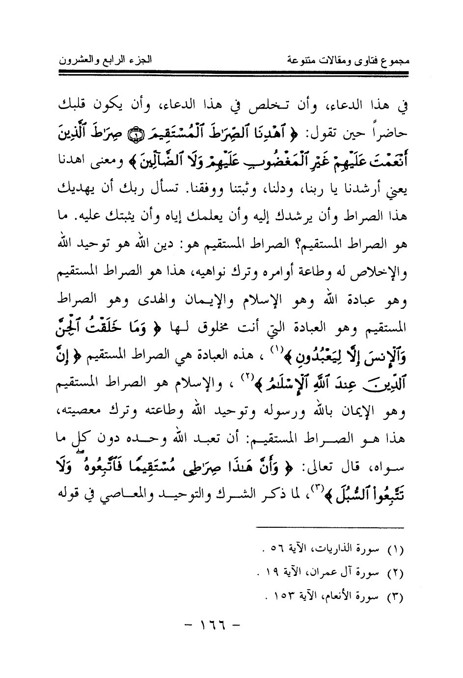 في هذا الدعاء، وأن تخلص في هذا الدعاء، وأن يكون قلبك حاضرا حين تقول: {اهْدِنَا الصِّرَاطَ الْمُسْتَقِيمَ} (¬1) {صِرَاطَ الَّذِينَ أَنْعَمْتَ عَلَيْهِمْ غَيْرِ الْمَغْضُوبِ عَلَيْهِمْ وَلَا الضَّالِّينَ} (¬2) ومعنى اهدنا يعني أرشدنا يا ربنا، ودلنا، وثبتنا ووفقنا. تسأل ربك أن يهديك هذا الصراط وأن يرشدك إليه وأن يعلمك إياه وأن يثبتك عليه. ما هو الصراط المستقيم؟ الصراط المستقيم هو: دين الله هو توحيد الله والإخلاص له وطاعة أوامره وترك نواهيه، هذا هو الصراط المستقيم وهو عبادة الله وهو الإسلام والإيمان والهدى وهو الصراط المستقيم وهو العبادة التي أنت مخلوق لها {وَمَا خَلَقْتُ الْجِنَّ وَالْإِنْسَ إِلَّا لِيَعْبُدُونِ} (¬3) هذه العبادة هي الصراط المستقيم {إِنَّ الدِّينَ عِنْدَ اللَّهِ الْإِسْلَامُ} (¬4) والإسلام هو الصراط المستقيم وهو الإيمان بالله ورسوله وتوحيد الله وطاعته وترك معصيته، هذا هو الصراط المستقيم: أن تعبد الله وحده دون كل ما سواه، قال تعالى: {وَأَنَّ هَذَا صِرَاطِي مُسْتَقِيمًا فَاتَّبِعُوهُ وَلَا تَتَّبِعُوا السُّبُلَ} (¬5) لما ذكر الشرك والتوحيد والمعاصي في قوله