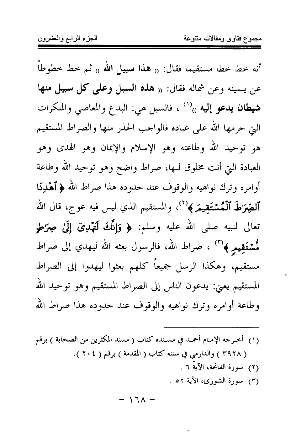 أنه خط خطا مستقيما فقال: «هذا سبيل الله (¬1) » ثم خط خطوطا عن يمينه وعن شماله فقال: «هذه السبل وعلى كل سبيل منها شيطان يدعو إليه (¬2) » . فالسبل هي: البدع والمعاصي والمنكرات التي حرمها الله على عباده فالواجب الحذر منها والصراط المستقيم هو توحيد الله وطاعته وهو الإسلام والإيمان وهو الهدى وهو العبادة التي أنت مخلوق لها، صراط واضح وهو توحيد الله وطاعة أوامره وترك نواهيه والوقوف عند حدوده هذا صراط الله {اهْدِنَا الصِّرَاطَ الْمُسْتَقِيمَ} (¬3) والمستقيم الذي ليس فيه عوج، قال الله تعالى لنبيه صلى الله عليه وسلم: {وَإِنَّكَ لَتَهْدِي إِلَى صِرَاطٍ مُسْتَقِيمٍ} (¬4) صراط الله، فالرسول بعثه الله ليهدي إلى صراط مستقيم، وهكذا الرسل جميعا كلهم بعثوا ليهدوا إلى الصراط المستقيم يعني: يدعون الناس إلى الصراط المستقيم وهو توحيد الله وطاعة أوامره وترك نواهيه والوقوف عند حدوده، هذا صراط الله