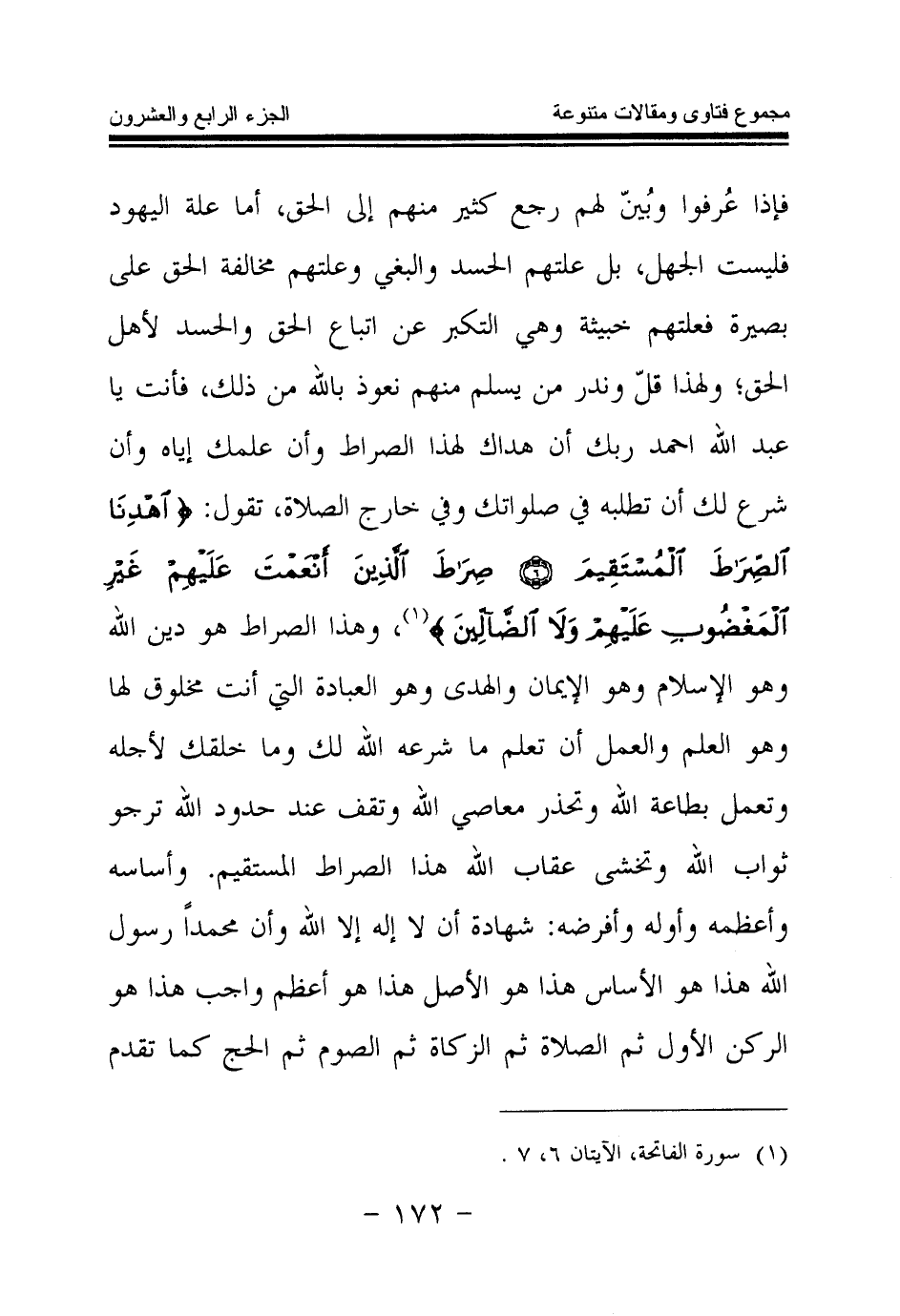 فإذا عرفوا وبين لهم رجع كثير منهم إلى الحق، أما علة اليهود فليست الجهل، بل علتهم الحسد والبغي وعلتهم مخالفة الحق على بصيرة فعلتهم خبيثة، وهي التكبر عن اتباع الحق والحسد لأهل الحق، ولهذا قل وندر من يسلم منهم نعوذ بالله من ذلك، فأنت يا عبد الله احمد ربك أن هداك لهذا الصراط، وأن علمك إياه وأن شرع لك أن تطلبه في صلواتك وفي خارج الصلاة، تقول: {اهْدِنَا الصِّرَاطَ الْمُسْتَقِيمَ} (¬1) {صِرَاطَ الَّذِينَ أَنْعَمْتَ عَلَيْهِمْ غَيْرِ الْمَغْضُوبِ عَلَيْهِمْ وَلَا الضَّالِّينَ} (¬2) وهذا الصراط هو دين الله وهو الإسلام وهو الإيمان والهدى وهو العبادة التي أنت مخلوق لها، وهو العلم والعمل أن تعلم ما شرعه الله لك، وما خلقك لأجله وتعمل بطاعة الله وتحذر معاصي الله، وتقف عند حدود الله ترجو ثواب الله، وتخشى عقاب الله هذا الصراط المستقيم، وأساسه وأعظمه وأوله وأفرضه: شهادة أن لا إله إلا الله، وأن محمدا رسول الله، هذا هو الأساس، هذا هو الأصل هذا هو أعظم واجب، هذا هو الركن الأول ثم الصلاة ثم الزكاة ثم الصوم ثم الحج كما تقدم