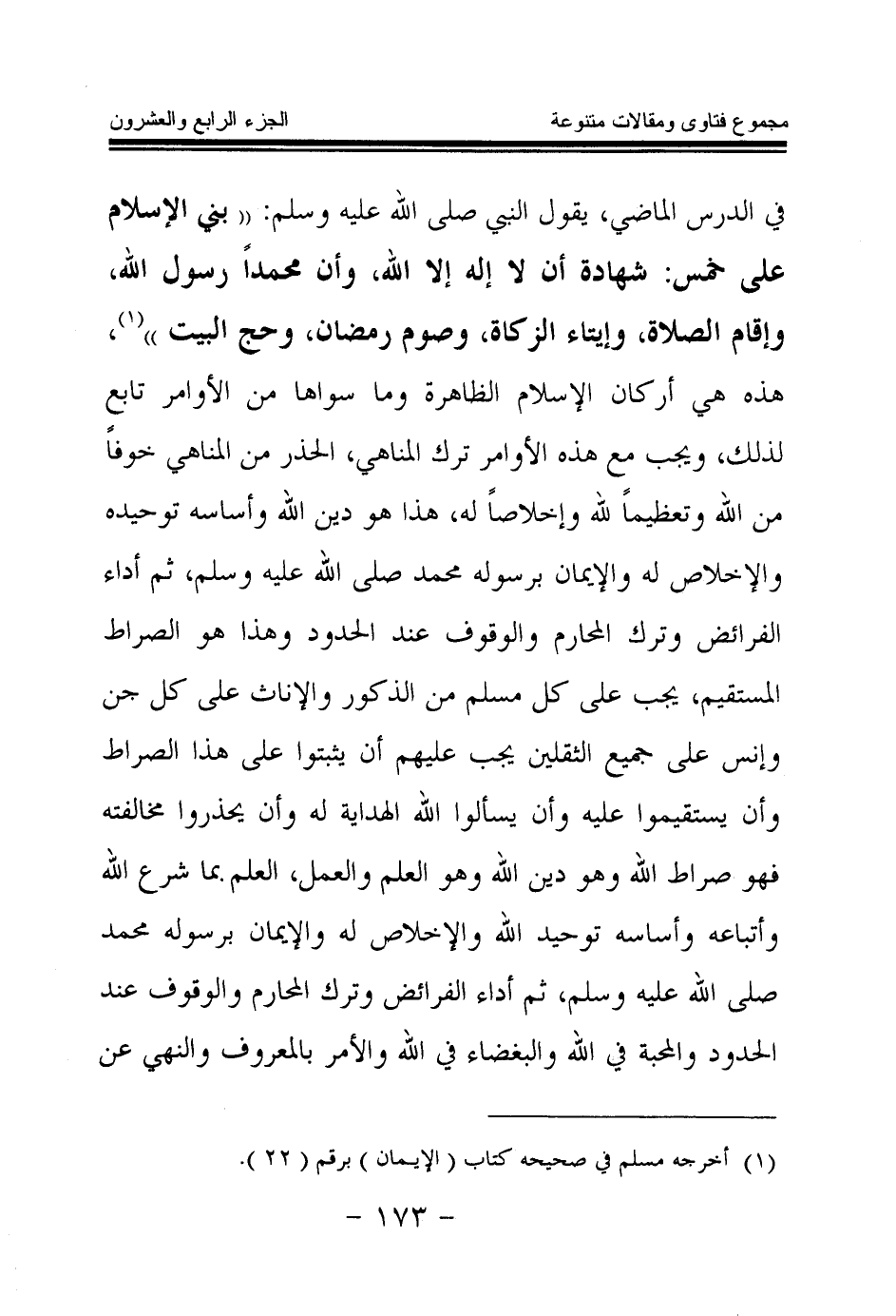 في الدرس الماضي، يقول النبي صلى الله عليه وسلم: «بني الإسلام على خمس: شهادة أن لا إله إلا الله، وأن محمدا رسول الله، وإقام الصلاة، وإيتاء الزكاة، وصوم رمضان، وحج البيت (¬1) » ، هذه هي أركان الإسلام الظاهرة وما سواها من الأوامر تابع لذلك، ويجب مع هذه الأوامر ترك المناهي، الحذر من المناهي خوفا من الله وتعظيما لله وإخلاصا له، هذا هو دين الله، وأساسه توحيده والإخلاص له والإيمان برسوله محمد صلى الله عليه وسلم، ثم أداء الفرائض وترك المحارم، والوقوف عند الحدود، وهذا هو الصراط المستقيم، يجب على كل مسلم من الذكور والإناث على كل جن وإنس على جميع الثقلين يجب عليهم أن يثبتوا على هذا الصراط، وأن يستقيموا عليه وأن يسألوا الله الهداية له، وأن يحذروا مخالفته فهو صراط الله وهو دين الله وهو العلم والعمل، العلم بما شرع الله واتباعه وأساسه توحيد الله والإخلاص له والإيمان برسوله محمد صلى الله عليه وسلم، ثم أداء الفرائض وترك المحارم والوقوف عند الحدود والمحبة في الله والبغضاء في الله والأمر بالمعروف والنهي عن