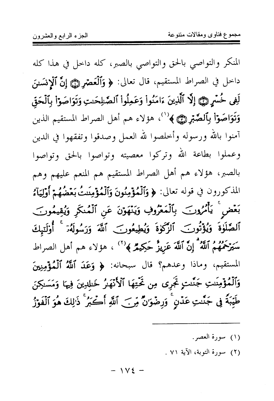 المنكر والتواصي بالحق والتواصي بالصبر، كله داخل في هذا كله داخل في الصراط المستقيم، قال تعالى: {وَالْعَصْرِ} (¬1) {إِنَّ الْإِنْسَانَ لَفِي خُسْرٍ} (¬2) {إِلَّا الَّذِينَ آمَنُوا وَعَمِلُوا الصَّالِحَاتِ وَتَوَاصَوْا بِالْحَقِّ وَتَوَاصَوْا بِالصَّبْرِ} (¬3) هؤلاء هم أهل الصراط المستقيم الذين آمنوا بالله ورسوله وأخلصوا لله العمل وصدقوا وتفقهوا في الدين وعملوا بطاعة الله، وتركوا معصيته وتواصوا بالحق وتواصوا بالصبر، هؤلاء هم أهل الصراط المستقيم هم المنعم عليهم وهم المذكورون في قوله تعالى: {وَالْمُؤْمِنُونَ وَالْمُؤْمِنَاتُ بَعْضُهُمْ أَوْلِيَاءُ بَعْضٍ يَأْمُرُونَ بِالْمَعْرُوفِ وَيَنْهَوْنَ عَنِ الْمُنْكَرِ وَيُقِيمُونَ الصَّلَاةَ وَيُؤْتُونَ الزَّكَاةَ وَيُطِيعُونَ اللَّهَ وَرَسُولَهُ أُولَئِكَ سَيَرْحَمُهُمُ اللَّهُ إِنَّ اللَّهَ عَزِيزٌ حَكِيمٌ} (¬4) هؤلاء هم أهل الصراط المستقيم، وماذا وعدهم؟ قال سبحانه: {وَعَدَ اللَّهُ الْمُؤْمِنِينَ وَالْمُؤْمِنَاتِ جَنَّاتٍ تَجْرِي مِنْ تَحْتِهَا الْأَنْهَارُ خَالِدِينَ فِيهَا وَمَسَاكِنَ طَيِّبَةً فِي جَنَّاتِ عَدْنٍ وَرِضْوَانٌ مِنَ اللَّهِ أَكْبَرُ ذَلِكَ هُوَ الْفَوْزُ الْعَظِيمُ} (¬5)