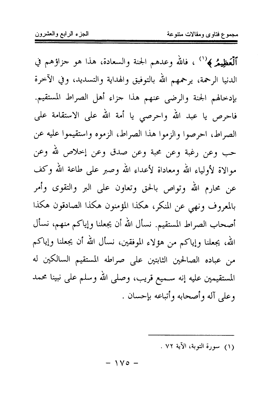 فالله وعدهم الجنة والسعادة، هذا هو جزاؤهم في الدنيا الرحمة، يرحمهم الله بالتوفيق والهداية والتسديد، وفي الآخرة بإدخالهم الجنة والرضى عنهم هذا جزاء أهل الصراط المستقيم، فاحرص يا عبد الله واحرصي يا أمة الله على الاستقامة على الصراط، احرصوا والزموا هذا الصراط، الزموه واستقيموا عليه عن حب وعن رغبة وعن محبة، وعن صدق وعن إخلاص لله، وعن موالاة لأولياء الله ومعاداة لأعداء الله وصبر على طاعة الله، وكف عن محارم الله وتواص بالحق وتعاون على البر والتقوى، وأمر بالمعروف ونهي عن المنكر، هكذا المؤمنون هكذا الصادقون هكذا أصحاب الصراط المستقيم، نسأل الله أن يجعلنا وإياكم منهم، نسأل الله، يجعلنا وإياكم من هؤلاء الموفقين، نسأل الله أن يجعلنا وإياكم من عباده الصالحين الثابتين على صراطه المستقيم السالكين له المستقيمين عليه إنه سميع قريب، وصلى الله وسلم على نبينا محمد وعلى آله وأصحابه وأتباعه بإحسان.