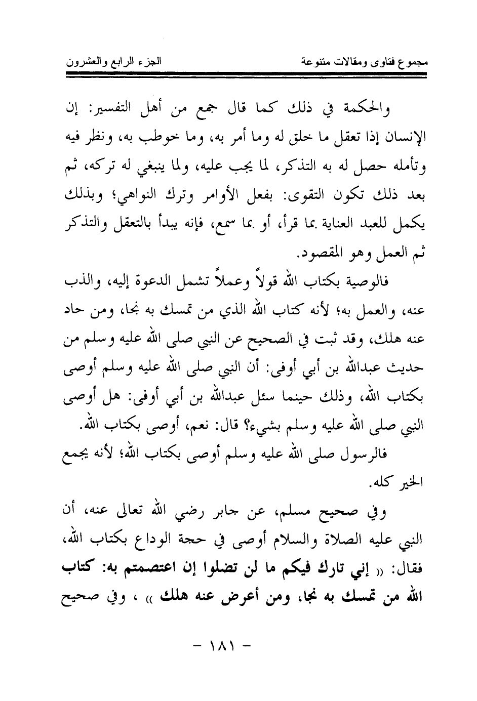 وفي صحيح مسلم، عن جابر رضي الله تعالى عنه، أن النبي عليه الصلاة والسلام أوصى في حجة الوداع بكتاب الله، فقال: «إني تارك فيكم ما لن تضلوا إن اعتصمتم به: كتاب الله من تمسك به نجا، ومن أعرض عنه هلك (¬2) » ، وفي صحيح