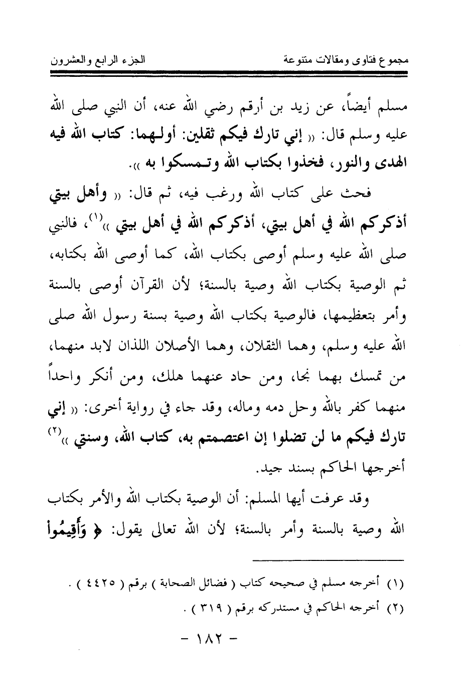 فحث على كتاب الله ورغب فيه، ثم قال: «وأهل بيتي أذكركم الله في أهل بيتي، أذكركم الله في أهل بيتي (¬2) » ، فالنبي صلى الله عليه وسلم أوصى بكتاب الله، كما أوصى الله بكتابه، ثم الوصية بكتاب الله وصية بالسنة؛ لأن القرآن أوصى بالسنة وأمر بتعظيمها، فالوصية بكتاب الله وصية بسنة رسول الله صلى الله عليه وسلم، وهما الثقلان، وهما الأصلان اللذان لا بد منهما، من تمسك بهما نجا، ومن حاد عنهما هلك، ومن أنكر واحدا منهما كفر بالله، وحل دمه وماله، وقد جاء في رواية أخرى: «إني تارك فيكم ما لن تضلوا إن اعتصمتم به، كتاب الله، وسنتي (¬3) » ، أخرجها الحاكم بسند جيد.