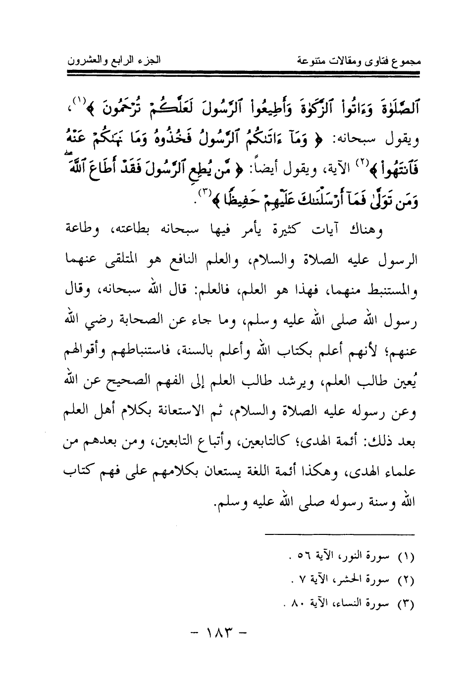 {وَأَقِيمُوا الصَّلَاةَ وَآتُوا الزَّكَاةَ وَأَطِيعُوا الرَّسُولَ لَعَلَّكُمْ تُرْحَمُونَ} (¬1) ويقول سبحانه: {وَمَا آتَاكُمُ الرَّسُولُ فَخُذُوهُ وَمَا نَهَاكُمْ عَنْهُ فَانْتَهُوا} (¬2) الآية، ويقول أيضا: {مَنْ يُطِعِ الرَّسُولَ فَقَدْ أَطَاعَ اللَّهَ وَمَنْ تَوَلَّى فَمَا أَرْسَلْنَاكَ عَلَيْهِمْ حَفِيظًا} (¬3)