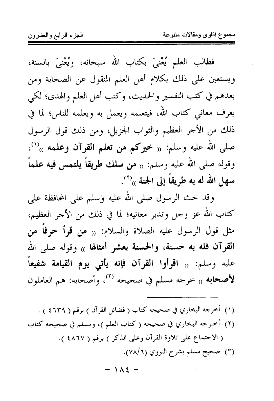 فطالب العلم يعنى بكتاب الله سبحانه، ويعنى بالسنة، ويستعين على ذلك بكلام أهل العلم المنقول عن الصحابة ومن بعدهم في كتب التفسير والحديث، وكتب أهل العلم والهدى؛ لكي يعرف معاني كتاب الله، فيتعلمه ويعمل به ويعلمه للناس، لما في ذلك من الأجر العظيم والثواب الجزيل، ومن ذلك قول الرسول صلى الله عليه وسلم: «خيركم من تعلم القرآن وعلمه (¬1) » ، وقوله صلى الله عليه وسلم: «من سلك طريقا يلتمس فيه علما سهل الله له به طريقا إلى الجنة (¬2) » .