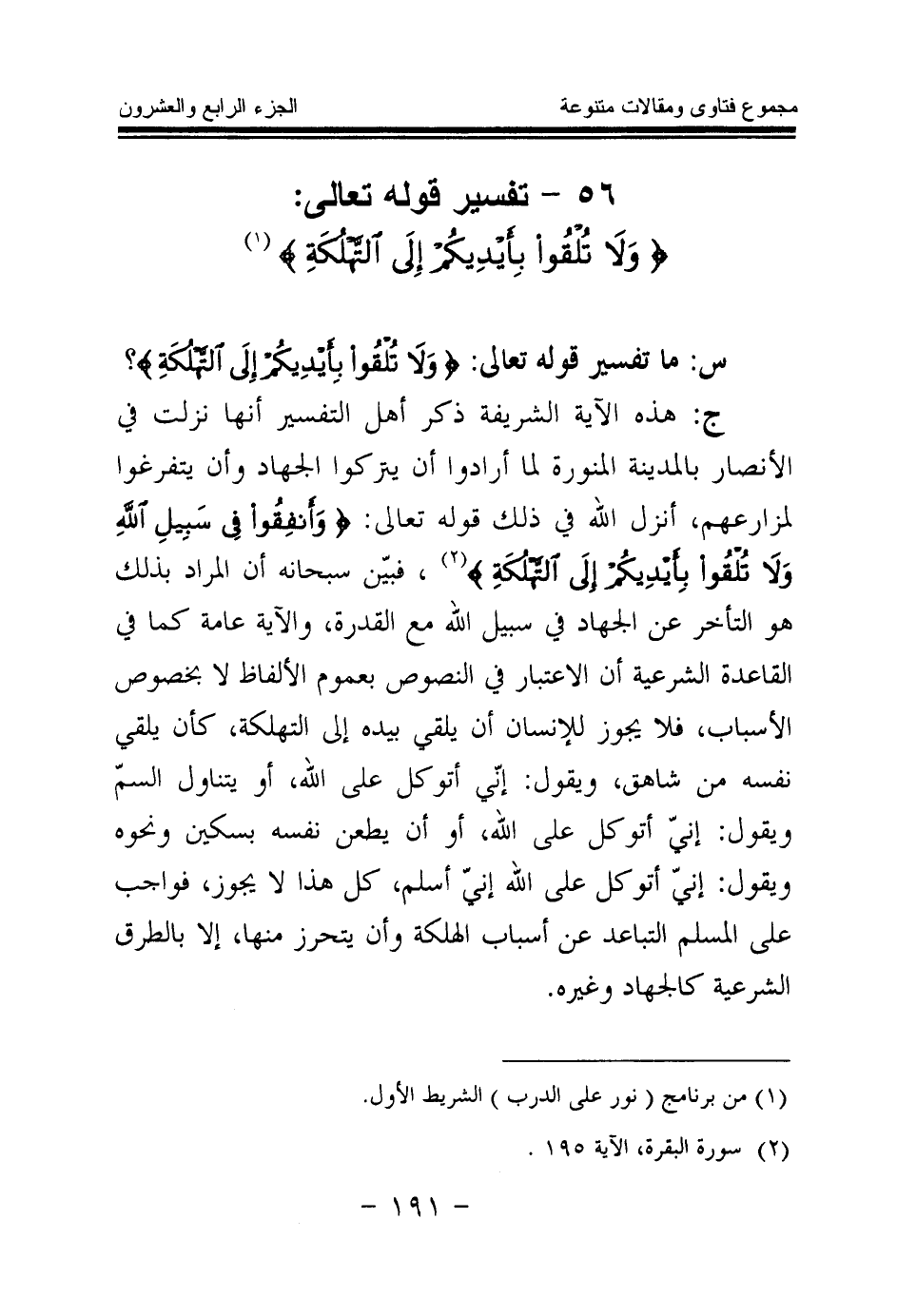 ج: هذه الآية الشريفة ذكر أهل التفسير أنها نزلت في الأنصار بالمدينة المنورة لما أرادوا أن يتركوا الجهاد، وأن يتفرغوا لمزارعهم، أنزل الله في ذلك قوله تعالى: {وَأَنْفِقُوا فِي سَبِيلِ اللَّهِ وَلَا تُلْقُوا بِأَيْدِيكُمْ إِلَى التَّهْلُكَةِ} (¬4) فبين سبحانه أن المراد بذلك هو التأخر عن الجهاد في سبيل الله مع القدرة، والآية عامة كما في القاعدة الشرعية أن الاعتبار في النصوص بعموم الألفاظ لا بخصوص الأسباب، فلا يجوز للإنسان أن يلقى بيده إلى التهلكة، كأن يلقي نفسه من شاهق، ويقول: إني أتوكل على الله، أو يتناول السم ويقول: إني أتوكل على الله، أو أن يطعن نفسه بسكين ونحوه ويقول: إني أتوكل على الله إني أسلم، كل هذا لا يجوز، فواجب على المسلم التباعد عن أسباب الهلكة وأن يتحرز منها، إلا بالطرق الشرعية كالجهاد وغيره.