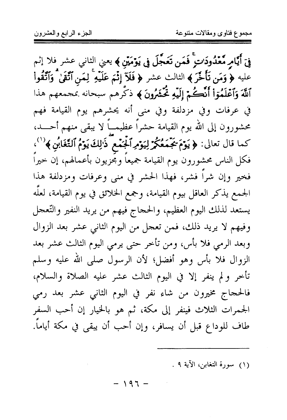 {وَاذْكُرُوا اللَّهَ فِي أَيَّامٍ مَعْدُودَاتٍ فَمَنْ تَعَجَّلَ فِي يَوْمَيْنِ} (¬1) يعني الثاني عشر فلا إثم عليه {وَمَنْ تَأَخَّرَ} (¬2) الثالث عشر {فَلَا إِثْمَ عَلَيْهِ لِمَنِ اتَّقَى وَاتَّقُوا اللَّهَ وَاعْلَمُوا أَنَّكُمْ إِلَيْهِ تُحْشَرُونَ} (¬3) ذكرهم سبحانه بمجمعهم هذا في عرفات، وفي مزدلفة، وفي منى أنه يحشرهم يوم القيامة فهم محشورون إلى الله يوم القيامة حشرا عظيما لا يبقى منهم أحد، كما قال تعالى: {يَوْمَ يَجْمَعُكُمْ لِيَوْمِ الْجَمْعِ ذَلِكَ يَوْمُ التَّغَابُنِ} (¬4) فكل الناس محشورون يوم القيامة جميعا ومجزيون بأعمالهم، إن خيرا فخير وإن شرا فشر، فهذا الحشر في منى وعرفات ومزدلفة هذا الجمع يذكر العاقل بيوم القيامة، وجمع الخلائق في يوم القيامة، لعله يستعد لذلك اليوم العظيم، والحجاج فيهم من يريد النفير والتعجل وفيهم لا يريد ذلك، فمن تعجل من اليوم الثاني عشر بعد الزوال وبعد الرمي فلا بأس، ومن تأخر حتى يرمي اليوم الثالث عشر بعد الزوال فلا بأس وهو أفضل؛ لأن الرسول صلى الله عليه وسلم تأخر، ولم ينفر إلا في اليوم الثالث عشر عليه الصلاة والسلام، فالحجاج مخيرون من شاء نفر في اليوم الثاني عشر بعد رمي الجمرات الثلاث فينفر إلى مكة، ثم هو بالخيار إن أحب السفر طاف للوداع قبل أن يسافر، وإن أحب أن يبقى في مكة أياما.