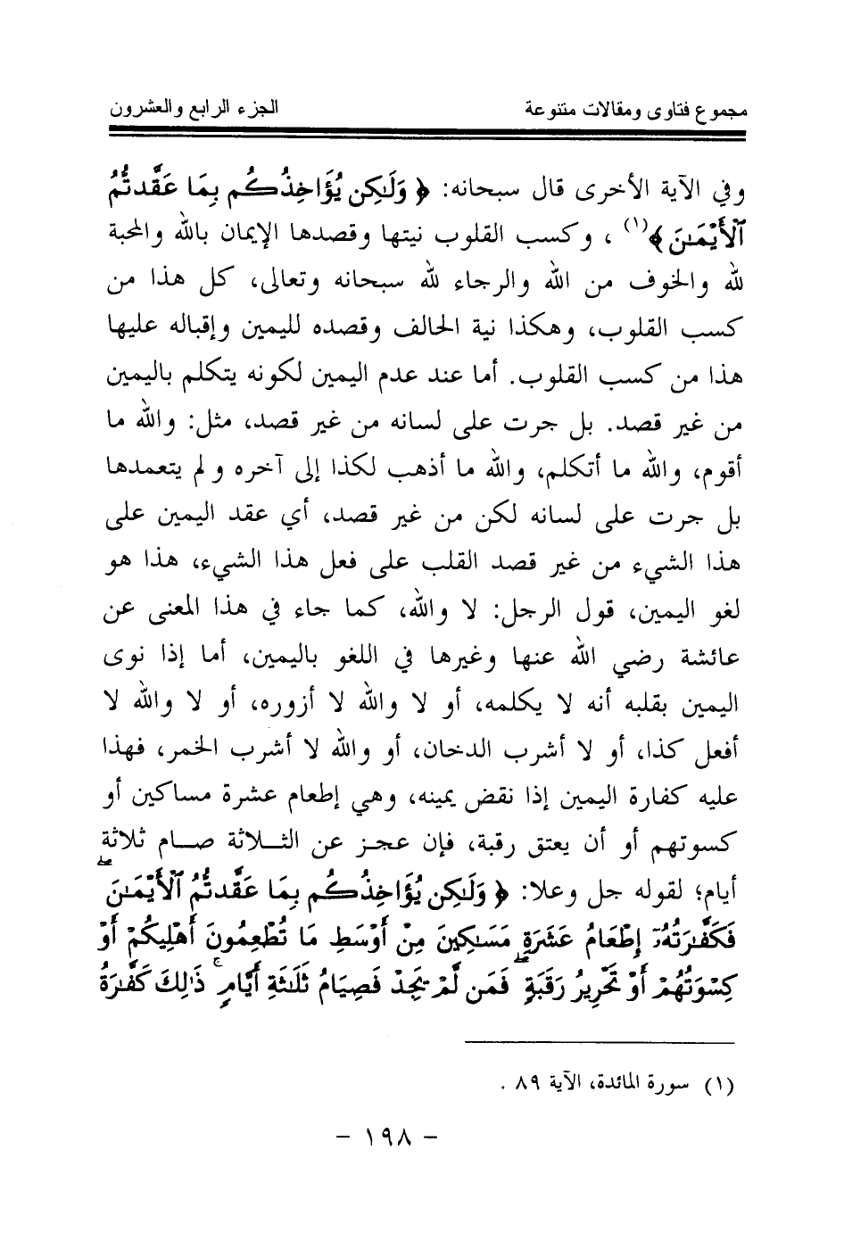 وفي الآية الأخرى قال سبحانه: {وَلَكِنْ يُؤَاخِذُكُمْ بِمَا عَقَّدْتُمُ الْأَيْمَانَ} (¬1) وكسب القلوب نيتها وقصدها الإيمان بالله والمحبة لله والخوف من الله والرجاء لله سبحانه وتعالى، كل هذا من كسب القلوب، وهكذا نية الحالف وقصده لليمين وإقباله عليها هذا من كسب القلوب، أما عند عدم اليمين لكونه يتكلم باليمين من غير قصد، بل جرت على لسانه من غير قصد، مثل: والله ما أقوم، والله ما أتكلم، والله ما أذهب لكذا إلى آخره ولم يتعمدها، بل جرت على لسانه لكن من غير قصد، أي عقد اليمين على هذا الشيء من غير قصد القلب على فعل هذا الشيء، هذا هو لغو اليمين، قول الرجل: لا والله، كما جاء في هذا المعنى عن عائشة رضي الله عنها وغيرها في اللغو باليمين، أما إذا نوى اليمين بقلبه أنه لا يكلمه، أو لا والله لا أزوره، أو لا والله لا أفعل كذا، أو لا أشرب الدخان، أو والله لا أشرب الخمر، فهذا عليه كفارة اليمن إذا نقض يمينه، وهي إطعام عشرة مساكين أو كسوتهم أو أن يعتق رقبة، فإن عجز عن الثلاثة صام ثلاثة أيام لقوله جل وعلا: {وَلَكِنْ يُؤَاخِذُكُمْ بِمَا عَقَّدْتُمُ الْأَيْمَانَ فَكَفَّارَتُهُ إِطْعَامُ عَشَرَةِ مَسَاكِينَ مِنْ أَوْسَطِ مَا تُطْعِمُونَ أَهْلِيكُمْ أَوْ كِسْوَتُهُمْ أَوْ تَحْرِيرُ رَقَبَةٍ فَمَنْ لَمْ يَجِدْ فَصِيَامُ ثَلَاثَةِ أَيَّامٍ ذَلِكَ كَفَّارَةُ أَيْمَانِكُمْ إِذَا حَلَفْتُمْ وَاحْفَظُوا أَيْمَانَكُمْ} (¬2)