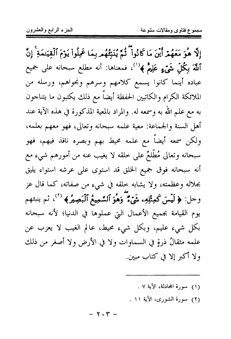 وقوله سبحانه وتعالى: {أَلَمْ تَرَ أَنَّ اللَّهَ يَعْلَمُ مَا فِي السَّمَاوَاتِ وَمَا فِي الْأَرْضِ مَا يَكُونُ مِنْ نَجْوَى ثَلَاثَةٍ إِلَّا هُوَ رَابِعُهُمْ وَلَا خَمْسَةٍ إِلَّا هُوَ سَادِسُهُمْ وَلَا أَدْنَى مِنْ ذَلِكَ وَلَا أَكْثَرَ إِلَّا هُوَ مَعَهُمْ أَيْنَ مَا كَانُوا ثُمَّ يُنَبِّئُهُمْ بِمَا عَمِلُوا يَوْمَ الْقِيَامَةِ إِنَّ اللَّهَ بِكُلِّ شَيْءٍ عَلِيمٌ} (¬1) فمعناها: أنه مطلع سبحانه على جميع عباده، أينما كانوا يسمع كلامهم وسرهم ونجواهم، ورسله من الملائكة الكرام والكاتبين الحفظة أيضا مع ذلك يكتبون ما يتناجون به مع علم الله به وسمعه له.