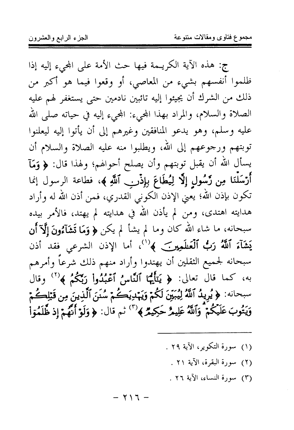 ج: هذه الآية الكريمة فيها حث الأمة على المجيء إليه إذا ظلموا أنفسهم بشيء من المعاصي، أو وقعوا فيما هو أكبر من ذلك من الشرك أن يجيئوا إليه تائبين نادمين حتى يستغفر لهم عليه الصلاة والسلام، والمراد بهذا المجيء: المجيء إليه في حياته صلى الله عليه وسلم، وهو يدعو المنافقين وغيرهم إلى أن يأتوا إليه ليعلنوا توبتهم ورجوعهم إلى الله، ويطلبوا منه عليه الصلاة والسلام أن يسأل الله أن يقبل توبتهم وأن يصلح أحوالهم؛ ولهذا قال: {وَمَا أَرْسَلْنَا مِنْ رَسُولٍ إِلَّا لِيُطَاعَ بِإِذْنِ اللَّهِ} (¬1) فطاعة الرسول إنما تكون بإذن الله؛ يعني الإذن الكوني القدري، فمن أذن الله له وأراد هدايته اهتدى، ومن لم يأذن الله في هدايته لم يهتد، الأمر بيده سبحانه، ما شاء الله كان وما لم يشأ لم يكن {وَمَا تَشَاءُونَ إِلَّا أَنْ يَشَاءَ اللَّهُ رَبُّ الْعَالَمِينَ} (¬2) أما الإذن الشرعي فقد أذن سبحانه لجميع الثقلين أن يهتدوا، وأراد منهم ذلك شرعا وأمرهم به، كما قال تعالى: {يَا أَيُّهَا النَّاسُ اعْبُدُوا رَبَّكُمُ} (¬3) وقال سبحانه: {يُرِيدُ اللَّهُ لِيُبَيِّنَ لَكُمْ وَيَهْدِيَكُمْ سُنَنَ الَّذِينَ مِنْ قَبْلِكُمْ وَيَتُوبَ عَلَيْكُمْ وَاللَّهُ عَلِيمٌ حَكِيمٌ} (¬4) ثم قال: