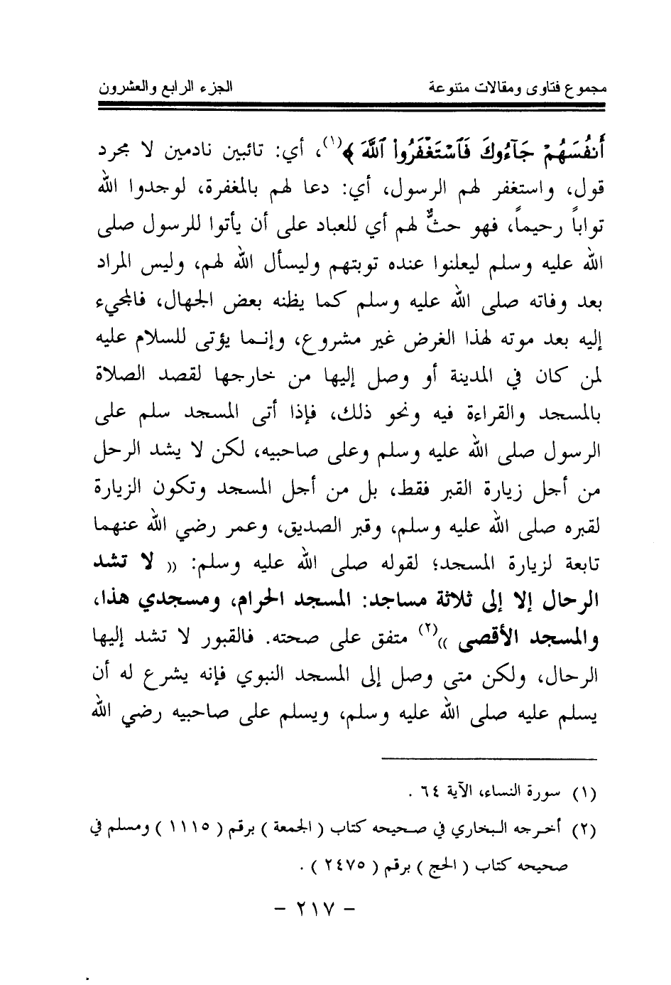 {وَلَوْ أَنَّهُمْ إِذْ ظَلَمُوا أَنْفُسَهُمْ جَاءُوكَ فَاسْتَغْفَرُوا اللَّهَ} (¬1) أي: تائبين نادمين لا مجرد قول، واستغفر لهم الرسول، أي: دعا لهم بالمغفرة، لوجدوا الله توابا رحيما، فهو حث لهم أي للعباد على أن يأتوا للرسول صلى الله عليه وسلم ليعلنوا عنده توبتهم وليسأل الله لهم، وليس المراد بعد وفاته صلى الله عليه وسلم كما يظنه بعض الجهال، فالمجيء إليه بعد موته لهذا الغرض غير مشروع، وإنما يؤتى للسلام عليه لمن كان في المدينة أو وصل إليها من خارجها لقصد الصلاة بالمسجد والقراءة فيه ونحو ذلك، فإذا أتى المسجد سلم على الرسول صلى الله عليه وسلم وعلى صاحبيه، لكن لا يشد الرحل من أجل زيارة القبر فقط، بل من أجل المسجد وتكون الزيارة لقبره صلى الله عليه وسلم، وقبر الصديق، وعمر رضي الله عنهما تابعة لزيارة المسجد لقوله صلى الله عليه وسلم: «لا تشد الرحال إلا إلى ثلاثة مساجد: المسجد الحرام، ومسجدي هذا، والمسجد الأقصى (¬2) » ، متفق على صحته، فالقبور لا تشد إليها الرحال، ولكن متى وصل إلى المسجد النبوي فإنه يشرع له أن يسلم عليه صلى الله عليه وسلم، ويسلم على صاحبيه رضي الله