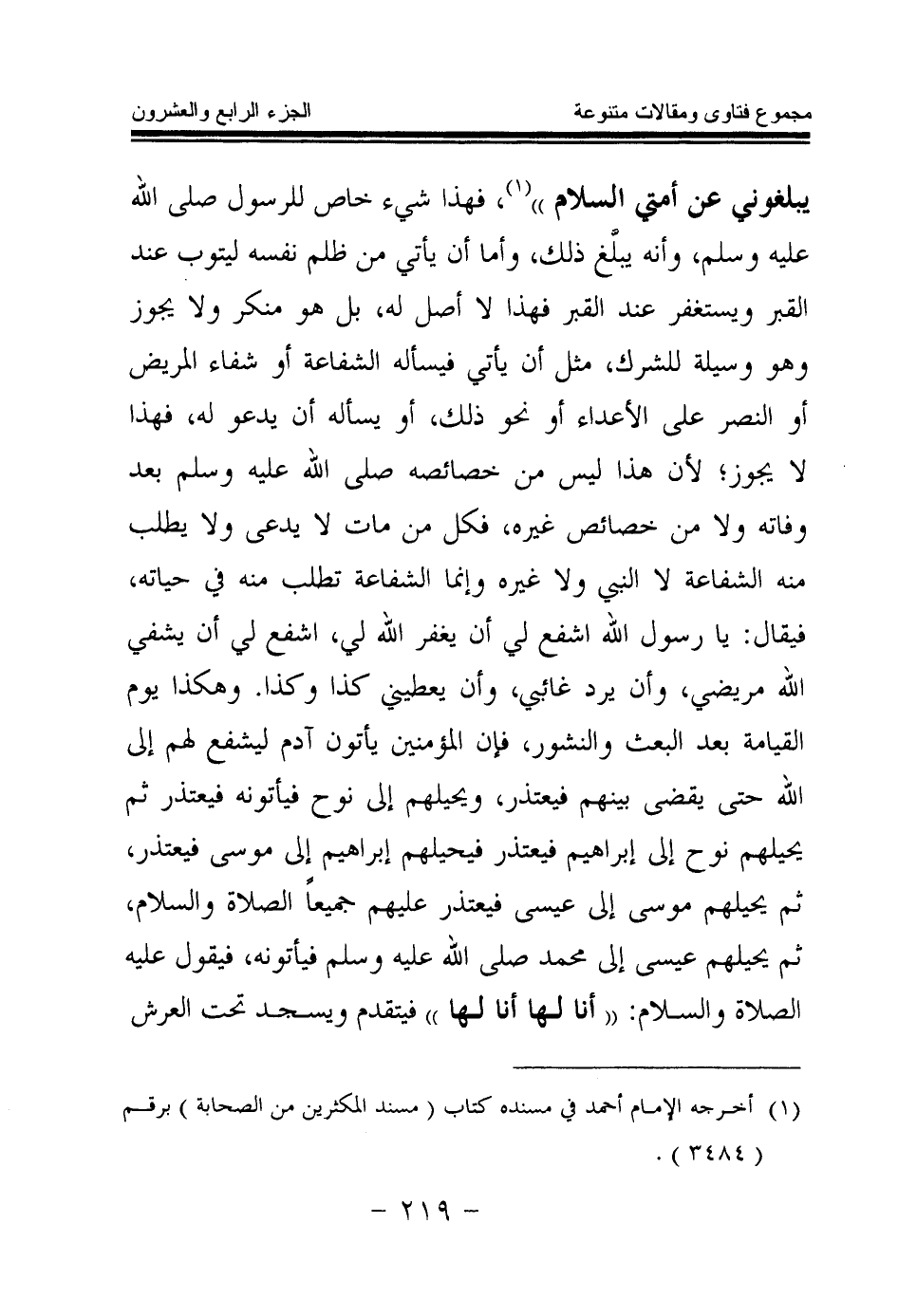 يبلغوني عن أمتي السلام (¬1) » ، فهذا شيء خاص للرسول صلى الله عليه وسلم، وأنه يبلغ ذلك، وأما أن يأتي من ظلم نفسه ليتوب عند القبر ويستغفر عند القبر فهذا لا أصل له، بل هو منكر، ولا يجوز وهو وسيلة للشرك، مثل أن يأتي فيسأله الشفاعة أو شفاء المريض أو النصر على الأعداء أو نحو ذلك، أو يسأله أن يدعو له فهذا لا يجوز؛ لأن هذا ليس من خصائصه صلى الله عليه وسلم بعد وفاته ولا من خصائص غيره، فكل من مات لا يدعى ولا يطلب منه الشفاعة لا النبي ولا غيره، وإنما الشفاعة تطلب منه في حياته، فيقال: يا رسول الله اشفع لي أن يغفر الله لي، اشفع لي أن يشفي الله مريضي، وأن يرد غائبي، وأن يعطني كذا وكذا، وهكذا يوم القيامة بعد البعث والنشور، فإن المؤمنين يأتون آدم ليشفع لهم إلى الله حتى يقضى بينهم فيعتذر، ويحيلهم إلى نوح فيأتونه فيعتذر، ثم يحيلهم نوح إلى إبراهيم فيعتذر فيحيلهم إبراهيم إلى موسى فيعتذر، ثم يحيلهم موسى إلى عيسى فيعتذر عليهم جميعا الصلاة والسلام، ثم يحيلهم عيسى إلى محمد صلى الله عليه وسلم فيأتونه، فيقول عليه الصلاة والسلام: «أنا لها، أنا لها (¬2) » ، فيتقدم ويسجد تحت العرش