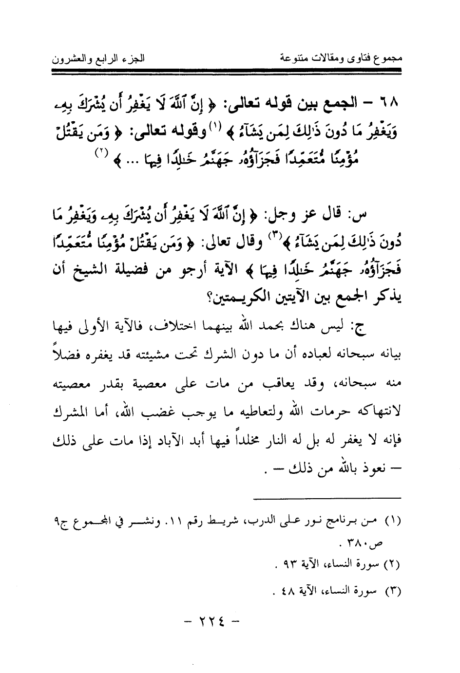 س: قال عز وجل: {إِنَّ اللَّهَ لَا يَغْفِرُ أَنْ يُشْرَكَ بِهِ وَيَغْفِرُ مَا دُونَ ذَلِكَ لِمَنْ يَشَاءُ} (¬3) وقال تعالى: {وَمَنْ يَقْتُلْ مُؤْمِنًا مُتَعَمِّدًا فَجَزَاؤُهُ جَهَنَّمُ خَالِدًا فِيهَا} (¬4) الآية أرجو من فضيلة الشيخ أن يذكر الجمع بين الآيتين الكريمتين؟