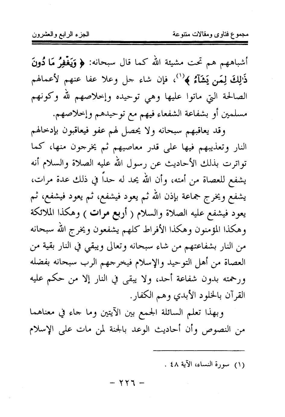 وقد يعاقبهم سبحانه ولا يحصل لهم عفو فيعاقبون بإدخالهم النار وتعذيبهم فيها على قدر معاصيهم ثم يخرجون منها، كما تواترت بذلك الأحاديث عن رسول الله عليه الصلاة والسلام أنه يشفع للعصاة من أمته، وأن الله يحد له حدا في ذلك عدة مرات، يشفع ويخرج جماعة بإذن الله ثم يعود فيشفع، ثم يعود فيشفع، ثم يعود فيشفع عليه الصلاة والسلام (أربع مرات) وهكذا الملائكة، وهكذا المؤمنون وهكذا الأفراط كلهم يشفعون ويخرج الله سبحانه من النار بشفاعتهم من شاء سبحانه وتعالى، ويبقي في النار بقية من العصاة من أهل التوحيد والإسلام فيخرجهم الرب سبحانه بفضله ورحمته بدون شفاعة أحد، ولا يبقى في النار إلا من حكم عليه القرآن بالخلود الأبدي وهم الكفار.