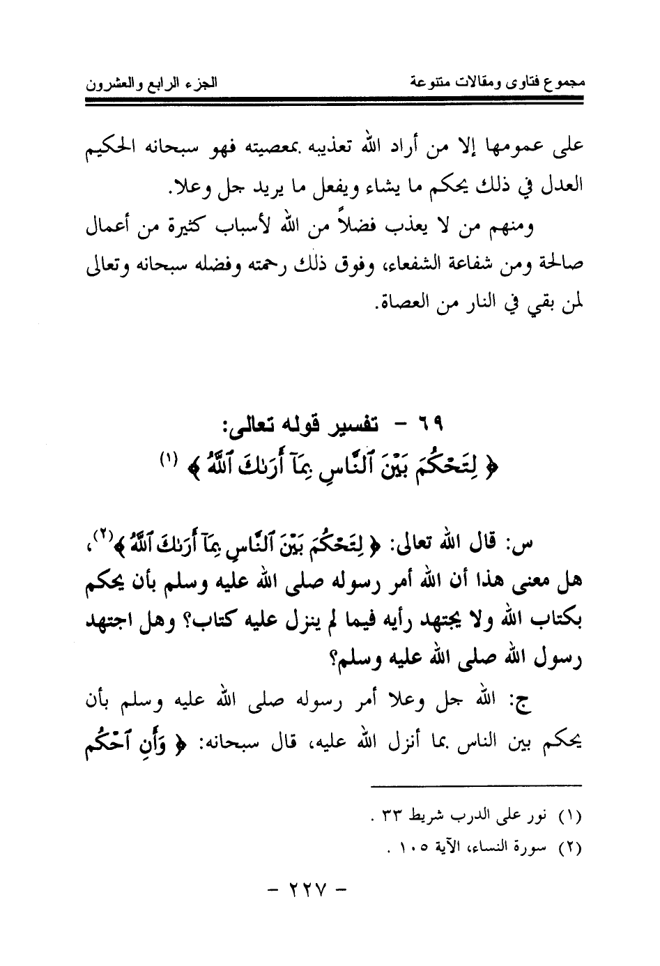 س: قال الله تعالى {لِتَحْكُمَ بَيْنَ النَّاسِ بِمَا أَرَاكَ اللَّهُ} (¬2) هل معنى هذا أن الله أمر رسوله صلى الله عليه وسلم بأن يحكم بكتاب الله، ولا يجتهد رأيه فيما لم ينزل عليه كتاب؟ وهل اجتهد رسول الله صلى الله عليه وسلم؟