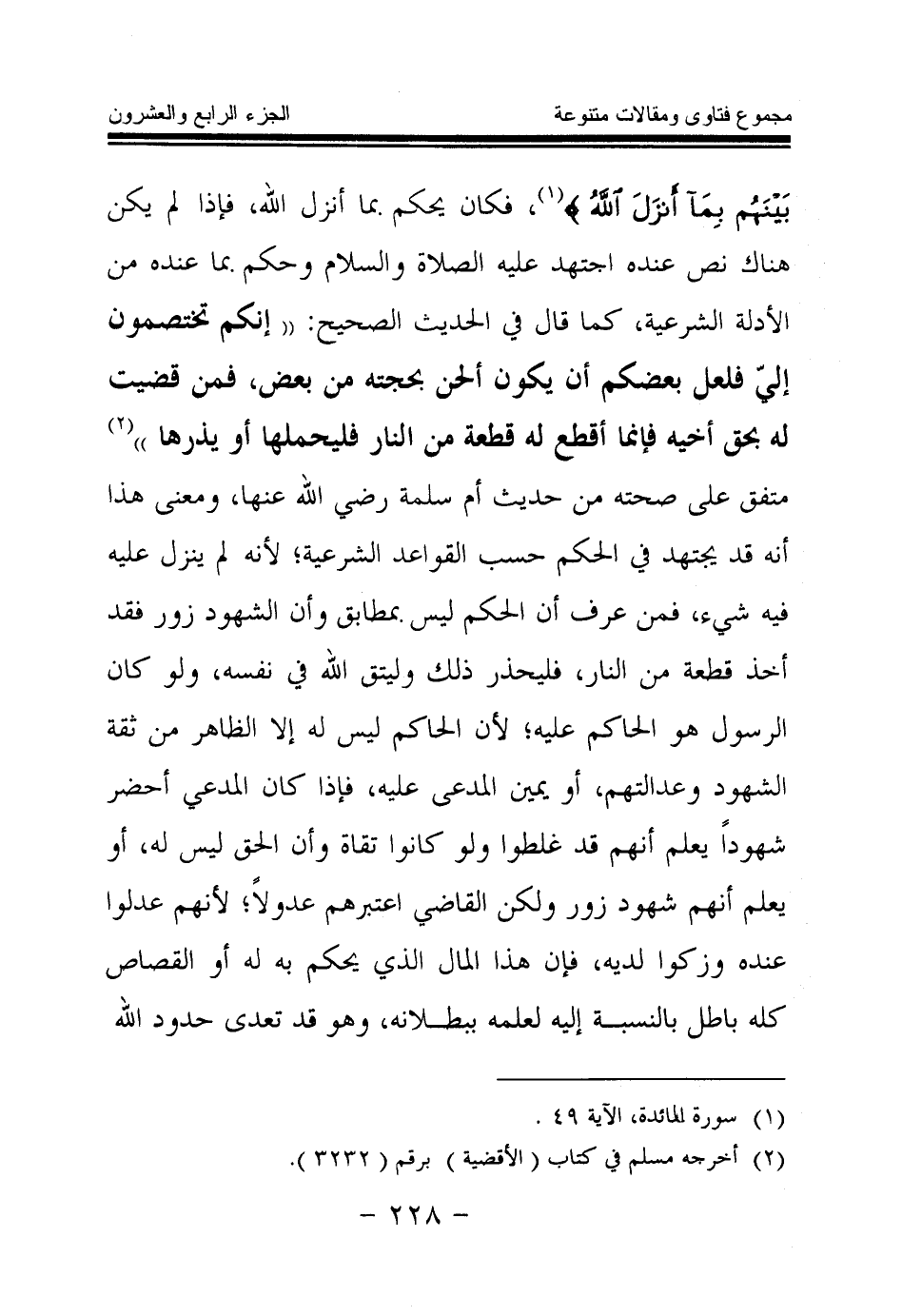 فكان يحكم بما أنزل الله، فإذا لم يكن هناك نص عنده اجتهد عليه الصلاة والسلام وحكم بما عنده من الأدلة الشرعية، كما قال في الحديث الصحيح: «إنكم تختصمون إلي فلعل بعضكم أن يكون ألحن بحجته من بعض، فمن قضيت له بحق أخيه فإنما أقطع له قطعة من النار فليحملها أو يذرها (¬1) » ، متفق على صحته من حديث أم سلمة رضي الله عنها، ومعنى هذا أنه قد يجتهد في الحكم حسب القواعد الشرعية؛ لأنه لم ينزل عليه فيه شيء، فمن عرف أن الحكم ليس بمطابق وأن الشهود زور فقد أخذ قطعة من النار، فليحذر ذلك وليتق الله في نفسه، ولو كان الرسول هو الحاكم عليه، لأن الحاكم ليس له إلا الظاهر من ثقة الشهود وعدالتهم، أو يمين المدعي عليه، فإذا كان المدعو أحضر شهودا علم أنهم قد غلطوا ولو كانوا تقاة وأن الحق ليس له، أو يعلم أنهم شهود زور ولكن القاضي اعتبرهم عدولا، لأنهم عدلوا عنده وزكوا لديه، فإن هذا المال الذي يحكم به له أو القصاص كله باطل بالنسبة إليه لعلمه ببطلانه، وهو قد تعدى حدود الله