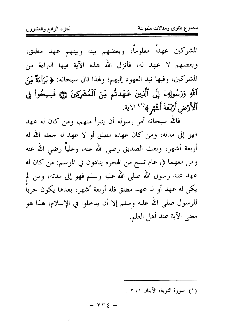 فالله سبحانه أمر رسوله أن يتبرأ منهم، ومن كان له عهد فهو إلى مدته، ومن كان عهده مطلقا أو لا عهد له جعله الله له أربعة أشهر، وبعث الصديق رضي الله عنه، وعليا رضي الله عنه ومن معهما في عام تسع من الهجرة ينادون في الموسم: من كان له عهد عند رسول الله صلى الله عليه وسلم فهو إلى مدته، ومن لم يكن له عهد أو له عهد مطلق فله أربعة أشهر، بعدها يكون حربا للرسول صلى الله عليه وسلم إلا أن يدخلوا في الإسلام، هذا هو معنى الآية عند أهل العلم.