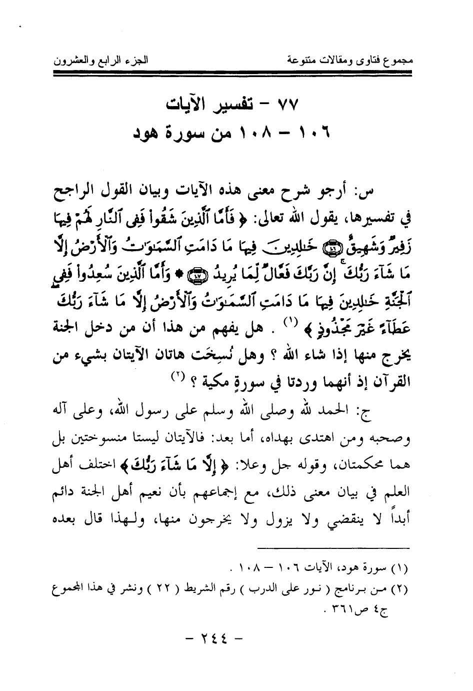 ج: الحمد لله وصلى الله وسلم على رسول الله، وعلى آله وصحبه ومن اهتدى بهداه. أما بعد: فالآيتان ليستا منسوختين بل هما محكمتان، وقوله جل وعلا: {إِلَّا مَا شَاءَ رَبُّكَ} (¬5) اختلف أهل العلم في بيان معنى ذلك، مع إجماعهم بأن نعيم أهل الجنة دائم أبدا لا ينقضي ولا يزول ولا يخرجون منها، ولهذا قال بعده