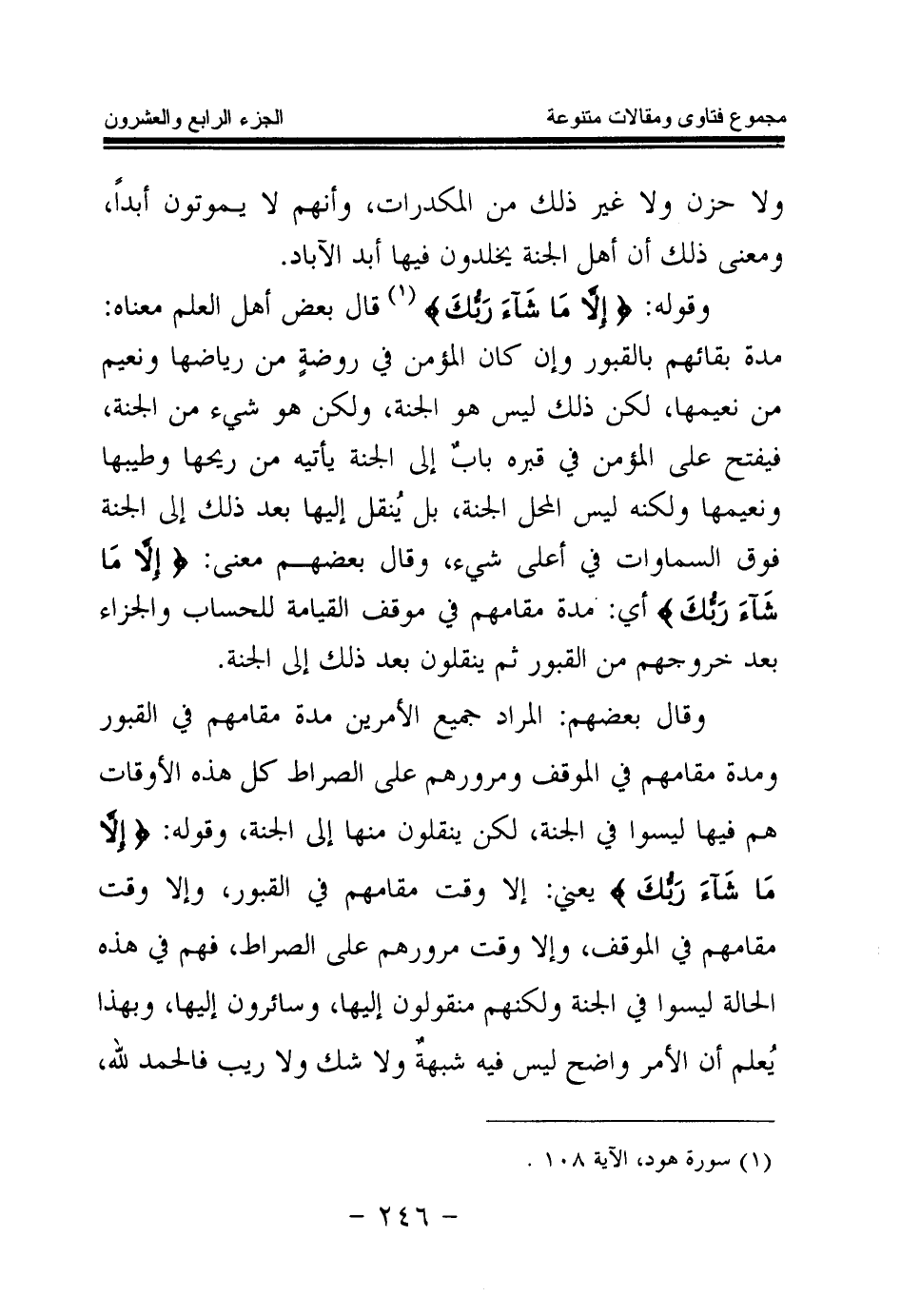 وقال بعضهم: المراد جميع الأمرين مدة مقامهم في القبور ومدة مقامهم في الموقف ومرورهم على الصراط كل هذه الأوقات هم فيها ليسوا في الجنة، لكن ينقلون منها إلى الجنة، وقوله: {إِلَّا مَا شَاءَ رَبُّكَ} (¬3) يعني إلا وقت مقامهم في القبور، وإلا وقت مقامهم في الموقف، وإلا وقت مرورهم على الصراط فهم في هذه الحالة ليسوا في الجنة ولكنهم منقولون إليها وسائرون إليها، وبهذا يعلم أن الأمر واضح ليس فيه شبهة ولا شك ولا ريب فالحمد لله.