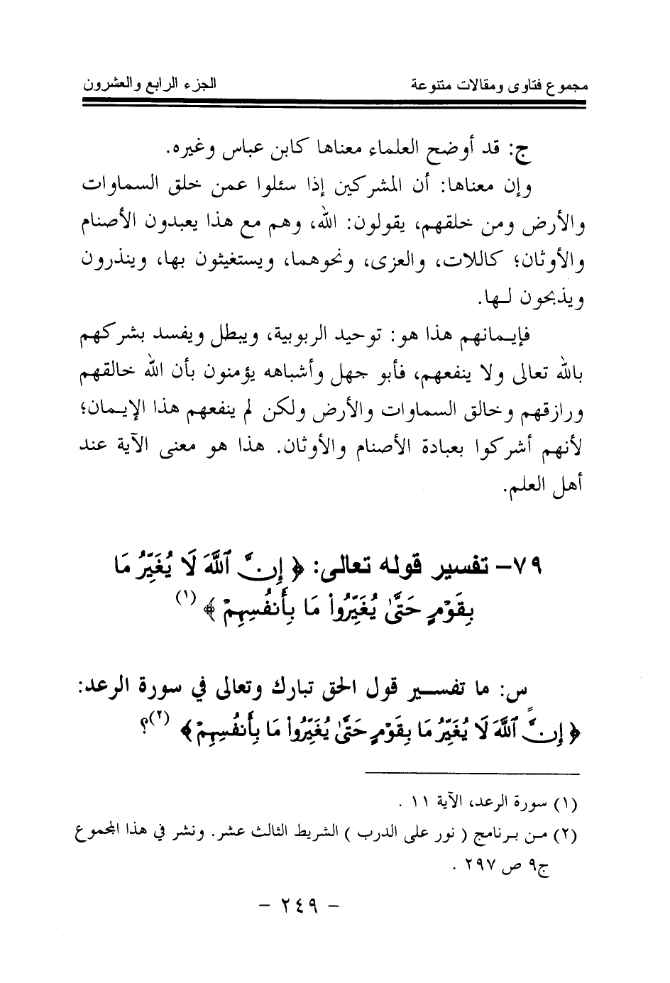 س: ما تفسير قول الحق تبارك وتعالى في سورة الرعد: {إِنَّ اللَّهَ لَا يُغَيِّرُ مَا بِقَوْمٍ حَتَّى يُغَيِّرُوا مَا بِأَنْفُسِهِمْ} (¬1) (¬2) ؟