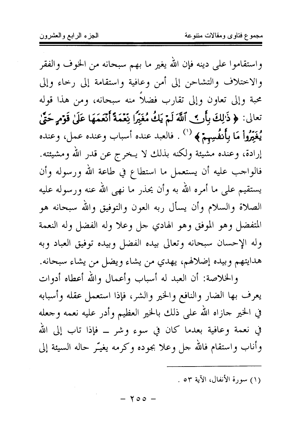 واستقاموا على دينه، فإن الله يغير ما بهم سبحانه من الخوف والفقر والاختلاف والتشاحن إلى أمن وعافية واستقامة إلى رخاء، وإلى محبة وإلى تعاون وإلى تقارب، فضلا منه سبحانه، ومن هذا قوله تعالى: {ذَلِكَ بِأَنَّ اللَّهَ لَمْ يَكُ مُغَيِّرًا نِعْمَةً أَنْعَمَهَا عَلَى قَوْمٍ حَتَّى يُغَيِّرُوا مَا بِأَنْفُسِهِمْ} (¬1) فالعبد عنده أسباب، وعنده عمل، وعنده إرادة، وعنده مشيئة، ولكنه بذلك لا يخرج عن قدر الله ومشيئته. فالواجب عليه أن يستعمل ما استطاع في طاعة الله ورسوله، وأن يستقيم على ما أمره الله به، وأن يحذر ما نهى الله عنه ورسوله عليه الصلاة والسلام، وأن يسأل ربه العون والتوفيق، والله سبحانه هو المتفضل، وهو الموفق، وهو الهادي جل وعلا، وله الفضل، وله النعمة، وله الإحسان، سبحانه وتعالى بيده الفضل، وبيده توفيق العباد، وبه هدايتهم، وبيده إضلالهم، يهدي من يشاء ويضل من يشاء سبحانه.
