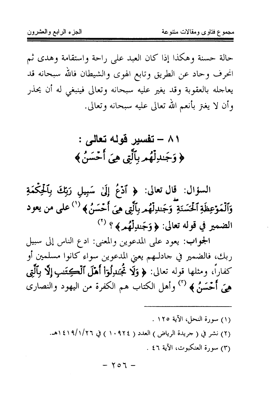 الجواب: يعود على المدعوين، والمعنى: ادع الناس إلى سبيل ربك، فالضمير في جادلهم يعني المدعوين، سواء كانوا مسلمين أو كفارا، ومثلها قوله تعالى: {وَلَا تُجَادِلُوا أَهْلَ الْكِتَابِ إِلَّا بِالَّتِي هِيَ أَحْسَنُ} (¬5) وأهل الكتاب هم الكفرة من اليهود والنصارى