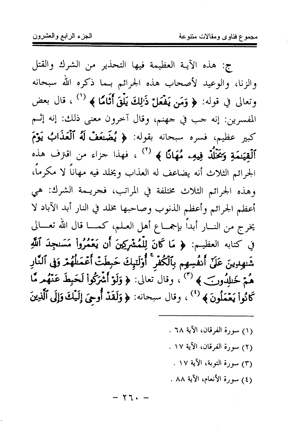 ج: هذه الآية العظيمة فيها التحذير من الشرك والقتل والزنا، والوعيد لأصحاب هذه الجرائم بما ذكره الله سبحانه وتعالى في قوله: {وَمَنْ يَفْعَلْ ذَلِكَ يَلْقَ أَثَامًا} (¬1) قال بعض المفسرين: إنه جب في جهنم، وقال آخرون معنى ذلك: إنه إثم كبير عظيم، فسره سبحانه بقوله: {يُضَاعَفْ لَهُ الْعَذَابُ يَوْمَ الْقِيَامَةِ وَيَخْلُدْ فِيهِ مُهَانًا} (¬2) فهذا جزاء من اقترف هذه الجرائم الثلاث أنه يضاعف له العذاب ويخلد فيه مهانا لا مكرما، وهذه الجرائم الثلاث مختلفة في المراتب، فجريمة الشرك: هي أعظم الجرائم وأعظم الذنوب وصاحبها مخلد في النار أبد الآباد، لا يخرج من النار أبدا بإجماع أهل العلم، كما قال الله تعالى في كتابه العظيم: {مَا كَانَ لِلْمُشْرِكِينَ أَنْ يَعْمُرُوا مَسَاجِدَ اللَّهِ شَاهِدِينَ عَلَى أَنْفُسِهِمْ بِالْكُفْرِ أُولَئِكَ حَبِطَتْ أَعْمَالُهُمْ وَفِي النَّارِ هُمْ خَالِدُونَ} (¬3) وقال تعالى: {وَلَوْ أَشْرَكُوا لَحَبِطَ عَنْهُمْ مَا كَانُوا يَعْمَلُونَ} (¬4) وقال سبحانه: