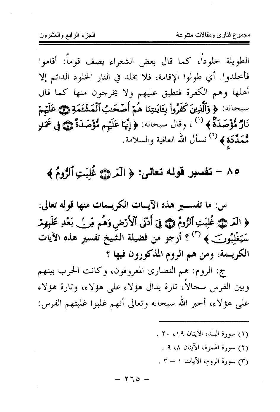 س: ما تفسير هذه الآيات الكريمات منها قوله تعالى: {الم} (¬3) {غُلِبَتِ الرُّومُ} (¬4) {فِي أَدْنَى الْأَرْضِ وَهُمْ مِنْ بَعْدِ غَلَبِهِمْ سَيَغْلِبُونَ} (¬5) ؟ أرجو من فضيلة الشيخ تفسير هذه الآيات الكريمة، ومن هم الروم المذكورون فيها؟