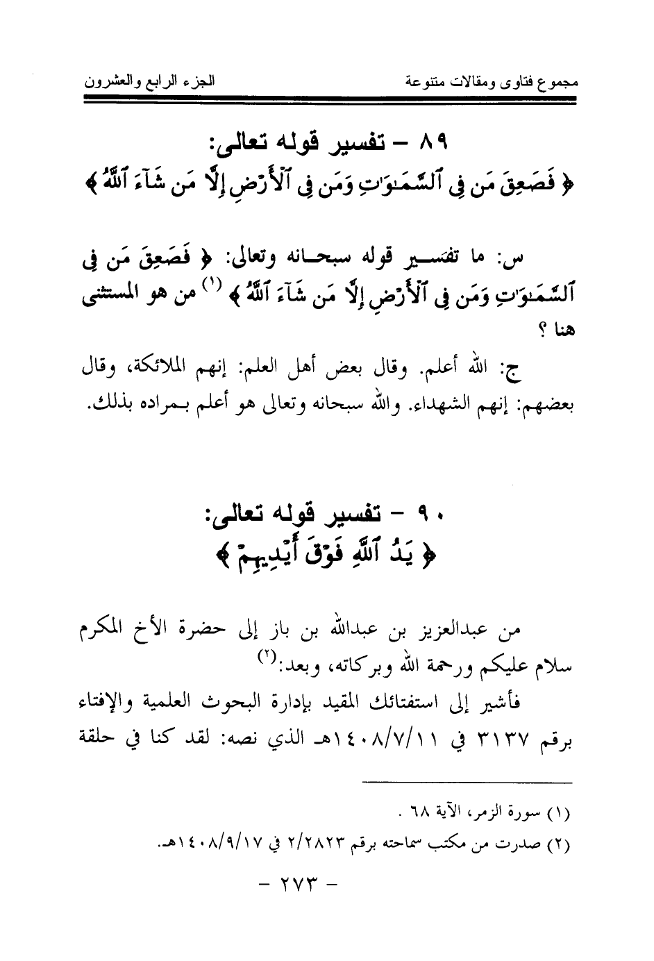س: ما تفسير قوله سبحانه وتعالى: {فَصَعِقَ مَنْ فِي السَّمَاوَاتِ وَمَنْ فِي الْأَرْضِ إِلَّا مَنْ شَاءَ اللَّهُ} (¬2) . من هو المستثنى هنا؟
