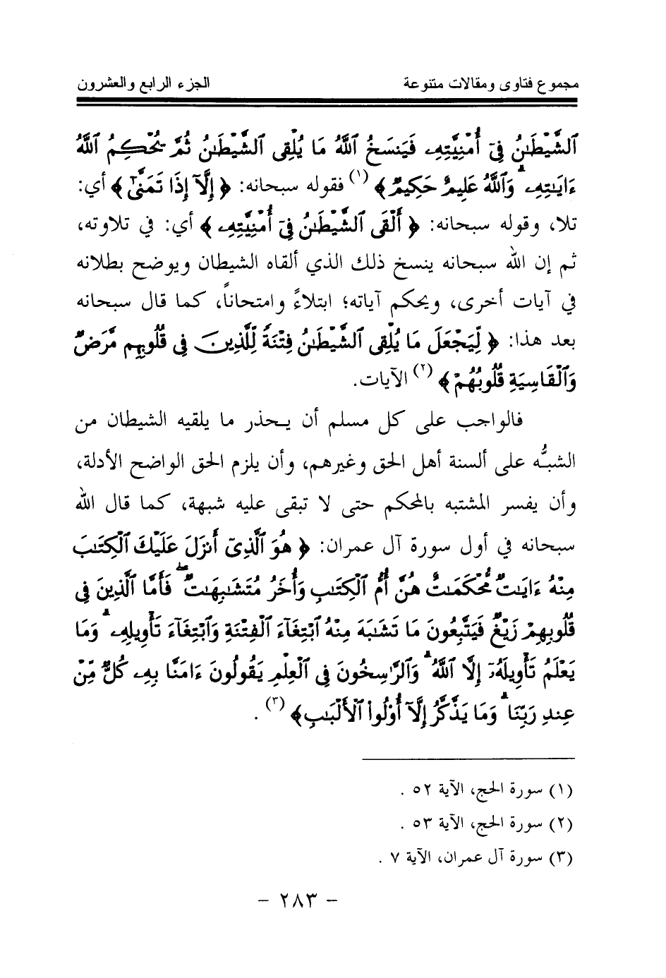 فالواجب على كل مسلم أن يحذر ما يلقيه الشيطان من الشبه على ألسنة أهل الحق وغيرهم، وأن يلزم الحق الواضح الأدلة، وأن يفسر المشتبه بالمحكم حتى لا تبقى عليه شبهة، كما قال الله سبحانه في أول سورة آل عمران: {هُوَ الَّذِي أَنْزَلَ عَلَيْكَ الْكِتَابَ مِنْهُ آيَاتٌ مُحْكَمَاتٌ هُنَّ أُمُّ الْكِتَابِ وَأُخَرُ مُتَشَابِهَاتٌ فَأَمَّا الَّذِينَ فِي قُلُوبِهِمْ زَيْغٌ فَيَتَّبِعُونَ مَا تَشَابَهَ مِنْهُ ابْتِغَاءَ الْفِتْنَةِ وَابْتِغَاءَ تَأْوِيلِهِ وَمَا يَعْلَمُ تَأْوِيلَهُ إِلَّا اللَّهُ وَالرَّاسِخُونَ فِي الْعِلْمِ يَقُولُونَ آمَنَّا بِهِ كُلٌّ مِنْ عِنْدِ رَبِّنَا وَمَا يَذَّكَّرُ إِلَّا أُولُو الْأَلْبَابِ} (¬5)