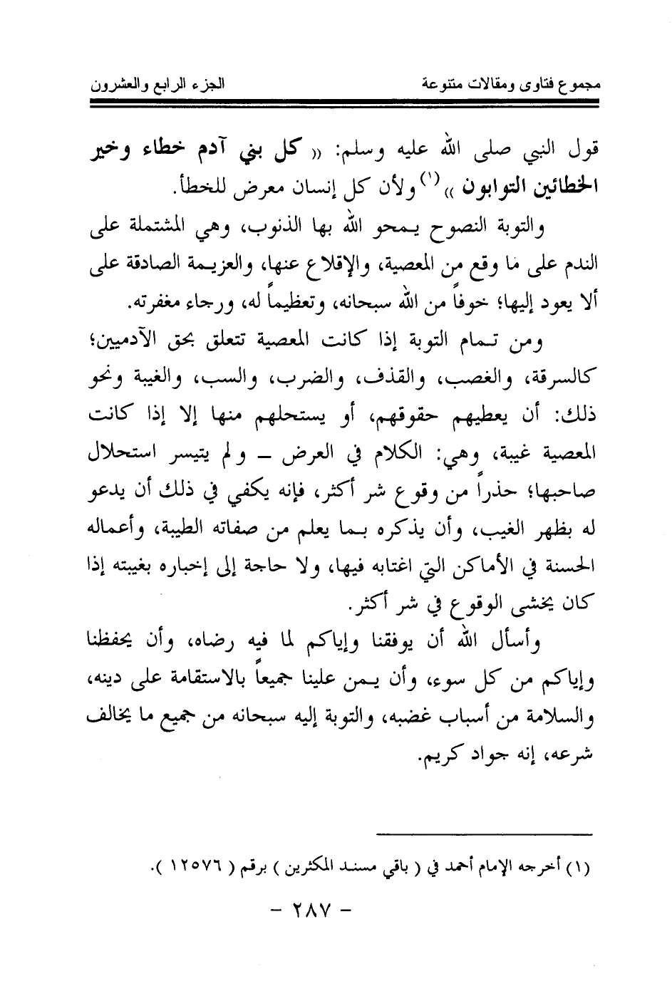 ومن تمام التوبة إذا كانت المعصية تتعلق بحق الآدميين، كالسرقة، والغصب، والقذف، والضرب، والسب، والغيبة ونحو ذلك: أن يعطيهم حقوقهم، أو يستحلهم منها إلا إذا كانت المعصية غيبة، وهي: الكلام في العرض - ولم يتيسر استحلال صاحبها، من وقوع شر أكثر، فإنه يكفي في ذلك أن يدعو له بظهر الغيب، وأن يذكره بما يعلم من صفاته الطيبة، وأعماله الحسنة في الأماكن التي اغتابه فيها، ولا حاجة إلى إخباره بغيبته إذا كان يخشى الوقوع في شر أكثر.