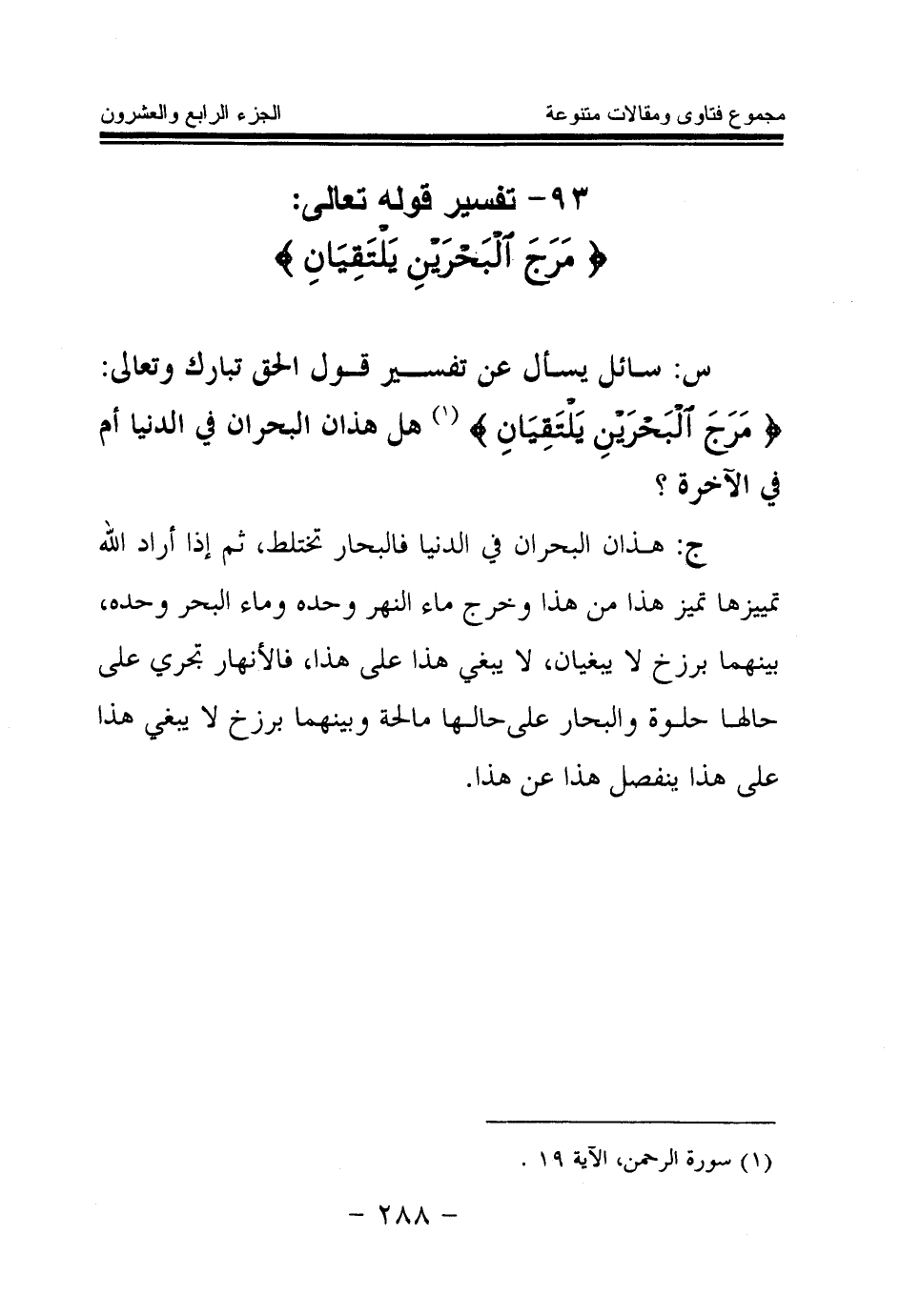 س: سائل يسأل عن تفسير قول الحق تبارك وتعالى: {مَرَجَ الْبَحْرَيْنِ يَلْتَقِيَانِ} (¬2) هل هذان البحران في الدنيا أم في الآخرة؟