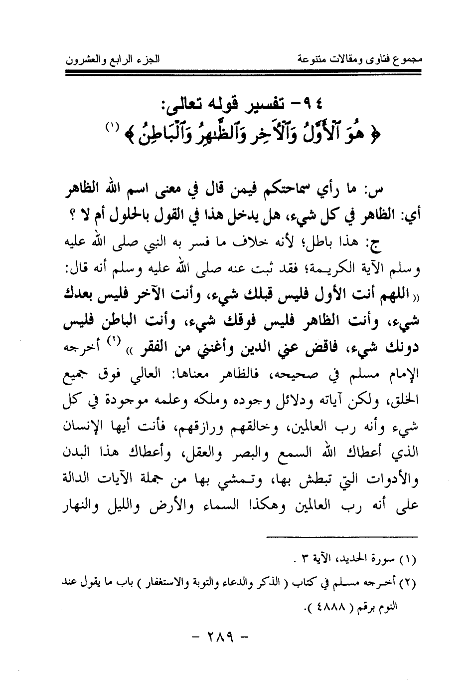 ج: هذا باطل؛ لأنه خلاف ما فسر به النبي - صلى الله عليه وسلم - الآية الكريمة؛ فقد ثبت عنه - صلى الله عليه وسلم - أنه قال: «اللهم أنت الأول، فليس قبلك شيء، وأنت الآخر فليس بعدك شيء، وأنت الظاهر فليس فوقك شيء، وأنت الباطن فليس دونك شيء، فاقض عني الدين وأغنني من الفقر (¬2) » . أخرجه الإمام مسلم في صحيحه، فالظاهر معناها: العالي فوق جميع الخلق، ولكن آياته ودلائل وجوده وملكه وعلمه موجودة في كل شيء، وأنه رب العالمين، وخالقهم ورازقهم، فأنت أيها الإنسان الذي أعطاك الله السمع والبصر والعقل، وأعطاك هذا البدن والأدوات التي تبطش بها، وتمشي بها من جملة الآيات الدالة على أنه رب العالمين وهكذا السماء والأرض والليل والنهار