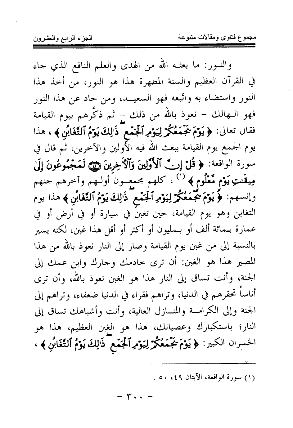 والنور: ما بعثه الله من الهدى والعلم النافع الذي جاء في القرآن العظيم والسنة المطهرة هذا هو النور، من أخذ هذا النور واستضاء به واتبعه فهو السعيد، ومن حاد عن هذا النور فهو الهالك - نعوذ بالله من ذلك - ثم ذكرهم بيوم القيامة فقال تعالى: {يَوْمَ يَجْمَعُكُمْ لِيَوْمِ الْجَمْعِ ذَلِكَ يَوْمُ التَّغَابُنِ} (¬1) هذا يوم الجمع يوم القيامة يبعث الله فيه الأولين والآخرين، ثم قال في سورة الواقعة: {قُلْ إِنَّ الْأَوَّلِينَ وَالْآخِرِينَ} (¬2) {لَمَجْمُوعُونَ إِلَى مِيقَاتِ يَوْمٍ مَعْلُومٍ} (¬3) كلهم مجمعون أولهم وآخرهم جنهم وإنسهم: {يَوْمَ يَجْمَعُكُمْ لِيَوْمِ الْجَمْعِ ذَلِكَ يَوْمُ التَّغَابُنِ} (¬4) هذا يوم التغابن وهو يوم القيامة، حين تغبن في سيارة أو في أرض أو في عمارة بمائة ألف أو بمليون أو أكثر أو أقل هذا غبن، لكنه يسير بالنسبة إلى من غبن يوم القيامة وصار إلى النار، نعوذ بالله من هذا المصير، هذا هو الغبن: أن ترى خادمك وجارك وابن عمك إلى الجنة، وأنت تساق إلى النار هذا هو الغبن نعوذ بالله، وأن ترى أناسا تحقرهم في الدنيا، وتراهم فقراء في الدنيا ضعفاء، وتراهم إلى الجنة وإلى الكرامة والمنازل العالية، وأنت وأشباهك تساق إلى النار باستكبارك وعصيانك، هذا هو الغبن العظيم، هذا هو الخسران الكبير: {يَوْمَ يَجْمَعُكُمْ لِيَوْمِ الْجَمْعِ ذَلِكَ يَوْمُ التَّغَابُنِ} (¬5)
