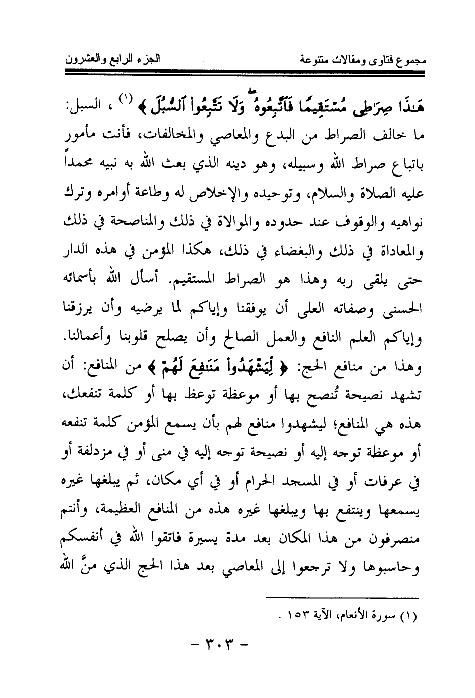 السبل: ما خالف الصراط من البدع والمعاصي والمخالفات، فأنت مأمور باتباع صراط الله وسبيله، وهو دينه الذي بعث الله به نبيه محمدا عليه الصلاة والسلام، وتوحيده والإخلاص له وطاعة أوامره وترك نواهيه، والوقوف عند حدوده والموالاة في ذلك، والمناصحة في ذلك والمعاداة في ذلك والبغضاء في ذلك، هكذا المؤمن في هذه الدار حتى يلقى ربه، وهذا هو الصراط المستقيم. أسأل الله بأسمائه الحسنى وصفاته العلا أن يوفقنا وإياكم لما يرضيه وأن يرزقنا وإياكم العلم النافع والعمل الصالح، وأن يصلح قلوبنا وأعمالنا. وهذا من منافع الحج: {لِيَشْهَدُوا مَنَافِعَ لَهُمْ} (¬1) من المنافع: أن تشهد نصيحة تنصح بها أو موعظة توعظ بها أو كلمة تنفعك هذه هي المنافع؛ ليشهدوا منافع لهم بأن يسمع المؤمن كلمة تنفعه أو موعظة توجه إليه أو نصيحة توجه إليه في منى أو في مزدلفة أو في عرفات أو في المسجد الحرام أو في أي مكان، ثم يبلغها غيره يسمعها وينتفع بها ويبلغها غيره هذه من المنافع العظيمة، وأنتم منصرفون من هذا المكان بعد مدة يسيرة فاتقوا الله في أنفسكم وحاسبوها ولا ترجعوا إلى المعاصي بعد هذا الحج الذي من الله