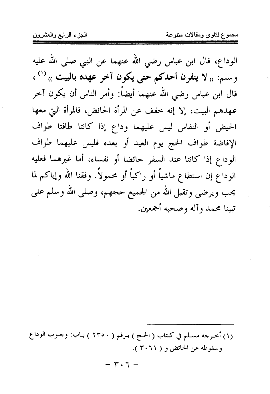 الوداع، قال ابن عباس - رضي الله عنهما - عن النبي - صلى الله عليه وسلم -: «لا ينفرن أحدكم حتى يكون آخر عهده بالبيت (¬1) » ، قال ابن عباس - رضي الله عنهما - أيضا: وأمر الناس أن يكون آخر عهدهم البيت، إلا إنه خفف عن المرأة الحائض، فالمرأة التي معها الحيض أو النفاس ليس عليهما وداع إذا كانتا طافتا طواف الإفاضة طواف الحج يوم العيد أو بعده، فليس عليهما طواف الوداع إذا كانتا عند السفر حائضا أو نفساء، أما غيرهما فعليه الوداع إن استطاع ماشيا أو راكبا أو محمولا. وفقنا الله وإياكم لما يحب ويرضى وتقبل الله من الجميع حجهم، وصلى الله وسلم على نبينا محمد وآله وصحبه أجمعين.