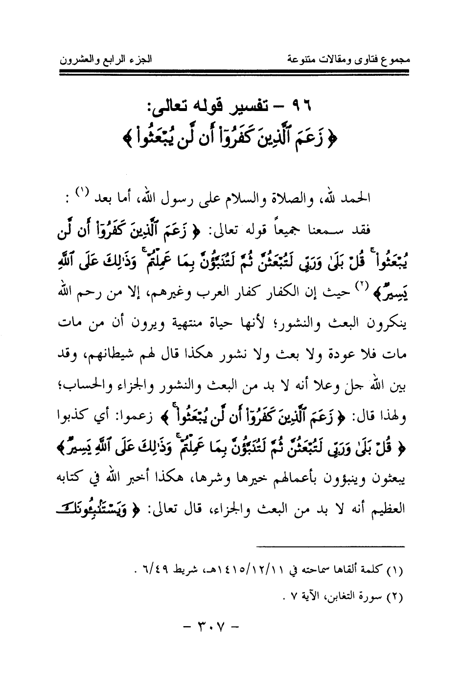 96 - تفسير قوله تعالى: {زَعَمَ الَّذِينَ كَفَرُوا أَنْ لَنْ يُبْعَثُوا} (¬1)