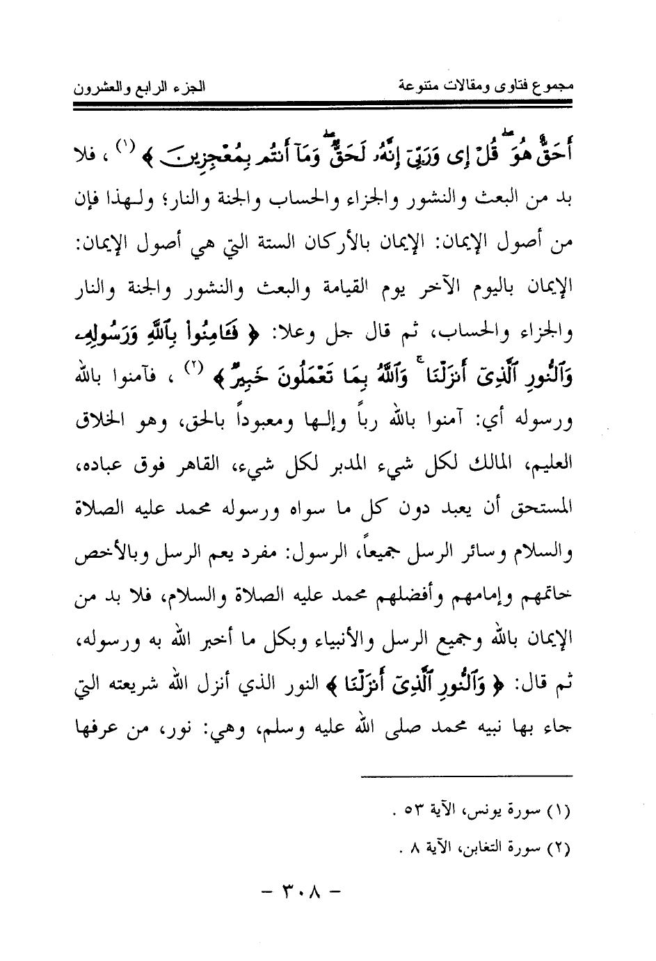 فلا بد من البعث والنشور والجزاء والحساب والجنة والنار؛ ولهذا فإن من أصول الإيمان: الإيمان بالأركان الستة التي هي أصول الإيمان: الإيمان باليوم الآخر يوم القيامة والبعث والنشور والجنة والنار والجزاء والحساب، ثم قال جل وعلا: {فَآمِنُوا بِاللَّهِ وَرَسُولِهِ وَالنُّورِ الَّذِي أَنْزَلْنَا وَاللَّهُ بِمَا تَعْمَلُونَ خَبِيرٌ} (¬1) فآمنوا بالله ورسوله أي: آمنوا بالله ربا وإلها ومعبودا بالحق، وهو الخلاق العليم، المالك لكل شيء المدبر لكل شيء، القاهر فوق عباده، المستحق أن يعبد دون كل ما سواه ورسوله محمد عليه الصلاة والسلام وسائر الرسل جميعا، الرسول: مفرد يعم الرسل وبالأخص خاتمهم وإمامهم وأفضلهم محمد عليه الصلاة والسلام، فلا بد من الإيمان بالله وجميع الرسل والأنبياء وبكل ما أخبر الله به ورسوله، ثم قال: {وَالنُّورِ الَّذِي أَنْزَلْنَا} (¬2) النور الذي أنزل الله شريعته التي جاء بها نبيه محمد - صلى الله عليه وسلم -وهي: نور، من عرفها