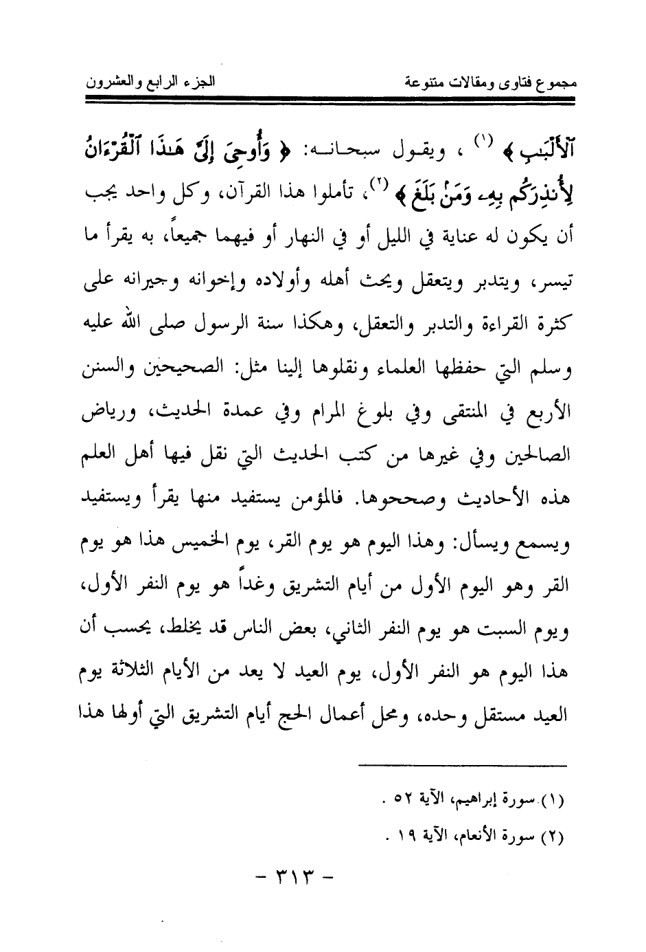 ويقول سبحانه: {وَأُوحِيَ إِلَيَّ هَذَا الْقُرْآنُ لِأُنْذِرَكُمْ بِهِ وَمَنْ بَلَغَ} (¬1) تأملوا هذا القرآن، وكل واحد يجب أن يكون له عناية في الليل أو في النهار أو فيهما جميعا، به يقرأ ما تيسر، ويتدبر ويتعقل ويحث أهله وأولاده وإخوانه وجيرانه على كثرة القراءة والتدبر والتعقل، وهكذا سنة الرسول - صلى الله عليه وسلم - التي حفظها العلماء ونقلوها إلينا مثل: الصحيحين والسنن الأربع في المنتقى، وفي بلوغ المرام، وفي عمدة الحديث، ورياض الصالحين وفي غيرها من كتب الحديث التي نقل فيها أهل العلم هذه الأحاديث وصححوها.