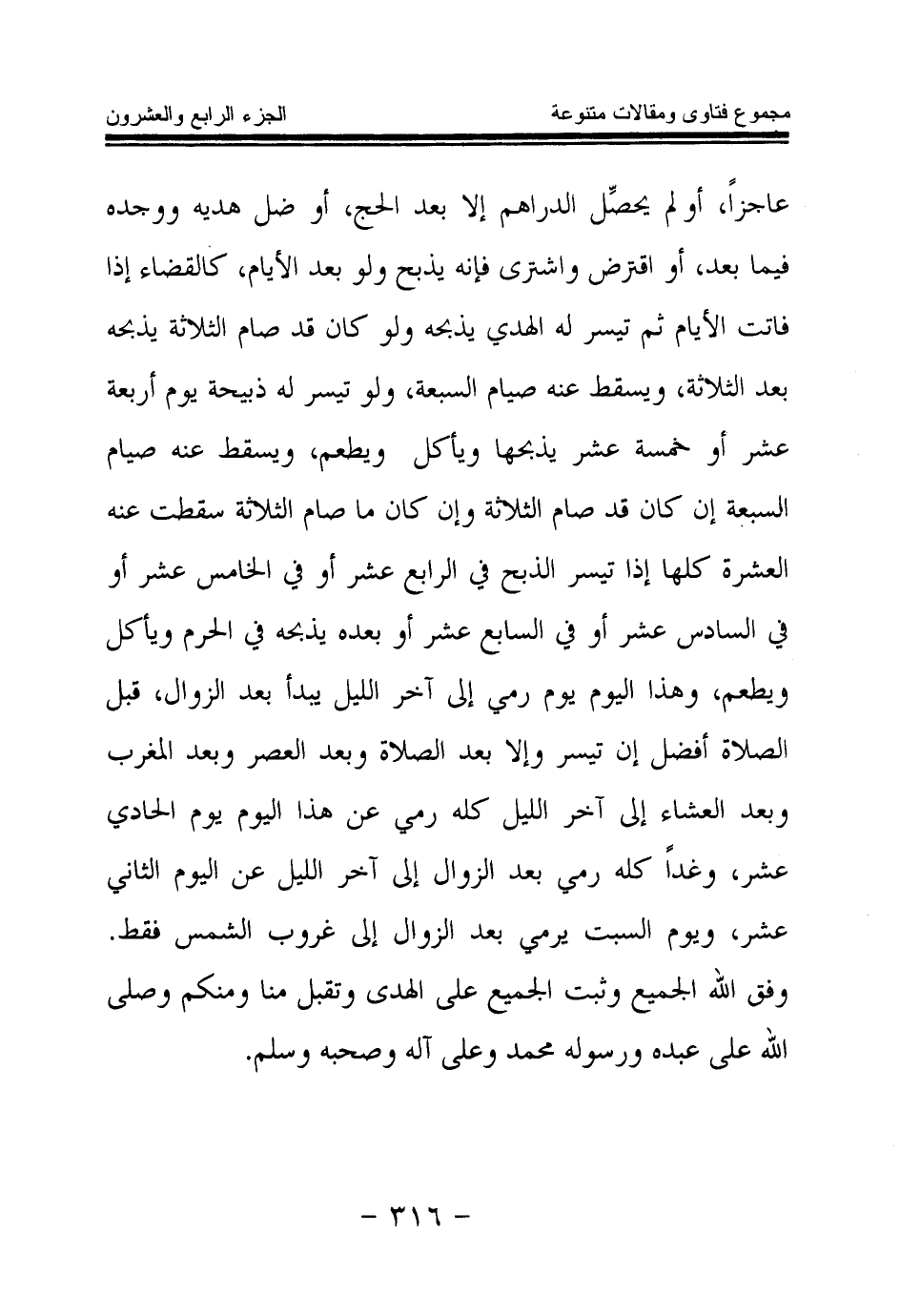 عاجزا، أو لم يحصل الدراهم إلا بعد الحج، أو ضل هديه ووجده فيما بعد، أو اقترض واشترى فإنه يذبح ولو بعد الأيام، كالقضاء إذا فاتت الأيام ثم تيسر له الهدي يذبحه، ولو كان قد صام الثلاثة يذبحه بعد الثلاثة، ويسقط عنه صيام السبعة، ولو تيسر له ذبيحة يوم أربعة عشر أو خمسة عشر يذبحها ويأكل ويطعم، ويسقط عنه صيام السبعة إن كان قد صام الثلاثة، وإن كان ما صام الثلاثة سقطت عنه العشرة كلها إذا تيسر الذبح في الرابع عشر أو في الخامس عشر أو في السادس عشر أو في السابع عشر أو بعده يذبحه في الحرم ويأكل ويطعم، وهذا اليوم يوم رمي إلى آخر الليل يبدأ بعد الزوال، قبل الصلاة أفضل إن تيسر وإلا بعد الصلاة وبعد العصر وبعد المغرب وبعد العشاء إلى آخر الليل كله رمي عن هذا اليوم يوم الحادي عشر، وغدا كله رمي بعد الزوال إلى آخر الليل عن اليوم الثاني عشر، ويوم السبت يرمي بعد الزوال إلى غروب الشمس فقط. وفق الله الجميع وثبت الجميع على الهدى، وتقبل منا ومنكم، وصلى الله على عبده ورسوله محمد وعلى آله وصحبه وسلم.