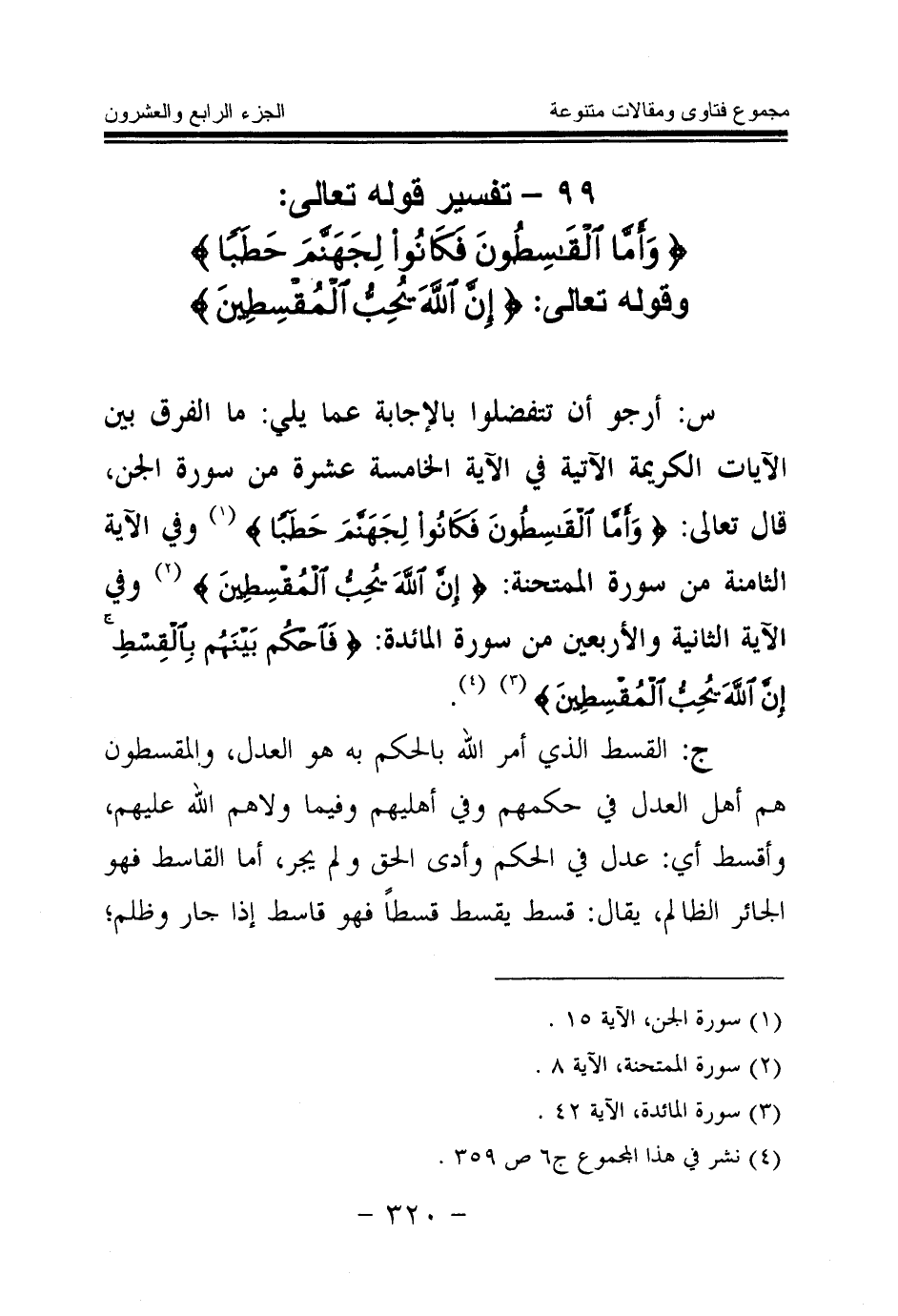 س: أرجو أن تتفضلوا بالإجابة عما يلي: ما الفرق بين الآيات الكريمة الآتية في الآية الخامسة عشرة من سورة الجن، قال تعالى: {وَأَمَّا الْقَاسِطُونَ فَكَانُوا لِجَهَنَّمَ حَطَبًا} (¬3) وفي الآية الثامنة من سورة الممتحنة: {إِنَّ اللَّهَ يُحِبُّ الْمُقْسِطِينَ} (¬4) وفي الآية الثانية والأربعين من سورة المائدة {فَاحْكُمْ بَيْنَهُمْ بِالْقِسْطِ إِنَّ اللَّهَ يُحِبُّ الْمُقْسِطِينَ} (¬5) (¬6) .