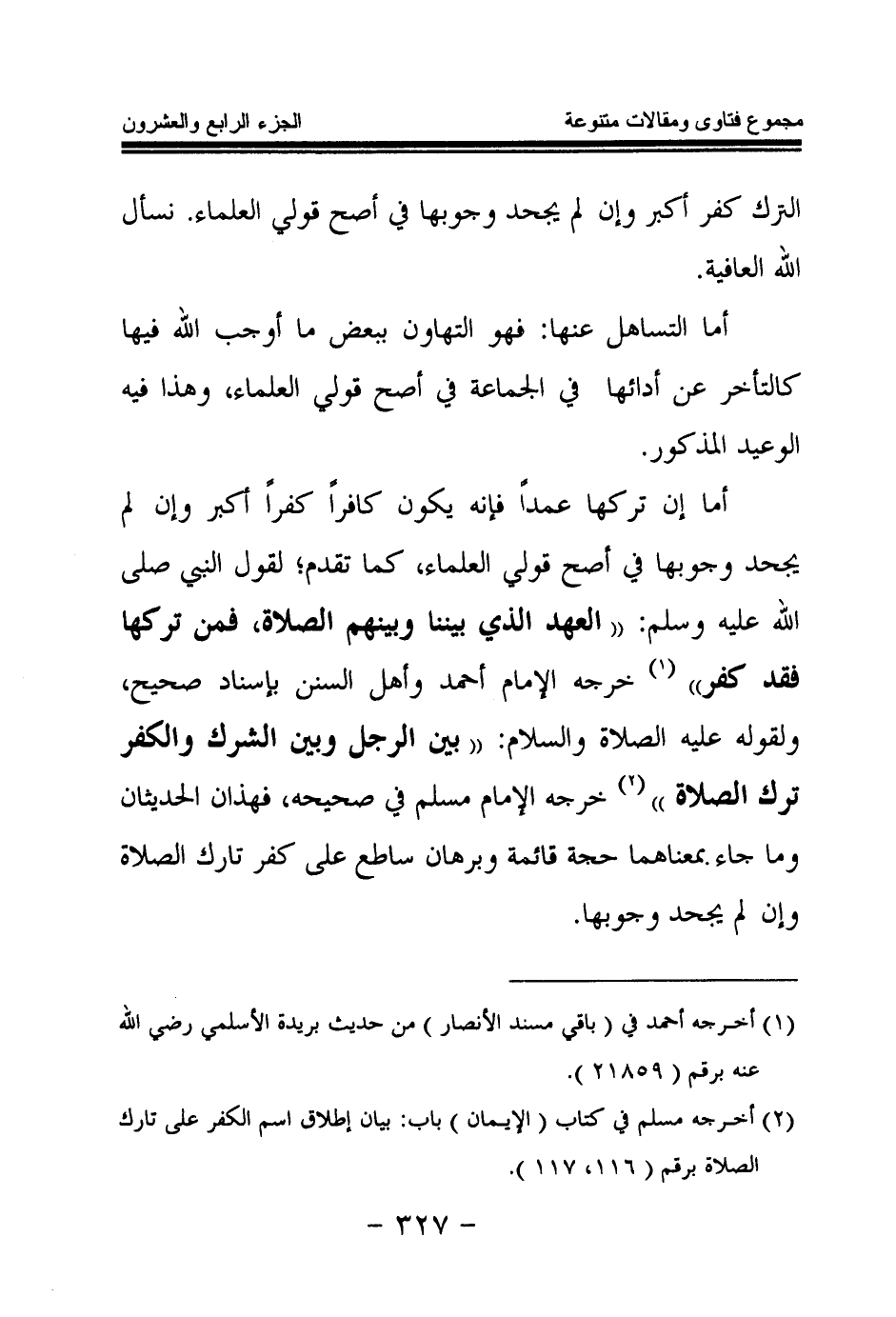 أما إن تركها عمدا فإنه يكون كافرا كفرا أكبر، وإن لم يجحد وجوبها في أصح قولي العلماء كما تقدم؛ لقول النبي - صلى الله عليه وسلم -: «العهد الذي بيننا وبينهم الصلاة، فمن تركها فقد كفر (¬1) » . خرجه الإمام أحمد وأهل السنن بإسناد صحيح، ولقوله عليه الصلاة والسلام: «بين الرجل وبين الشرك والكفر ترك الصلاة (¬2) » . خرجه الإمام مسلم في صحيحه، فهذان الحديثان وما جاء بمعناهما حجة قائمة وبرهان ساطع على كفر تارك الصلاة وإن لم يجحد وجوبها.