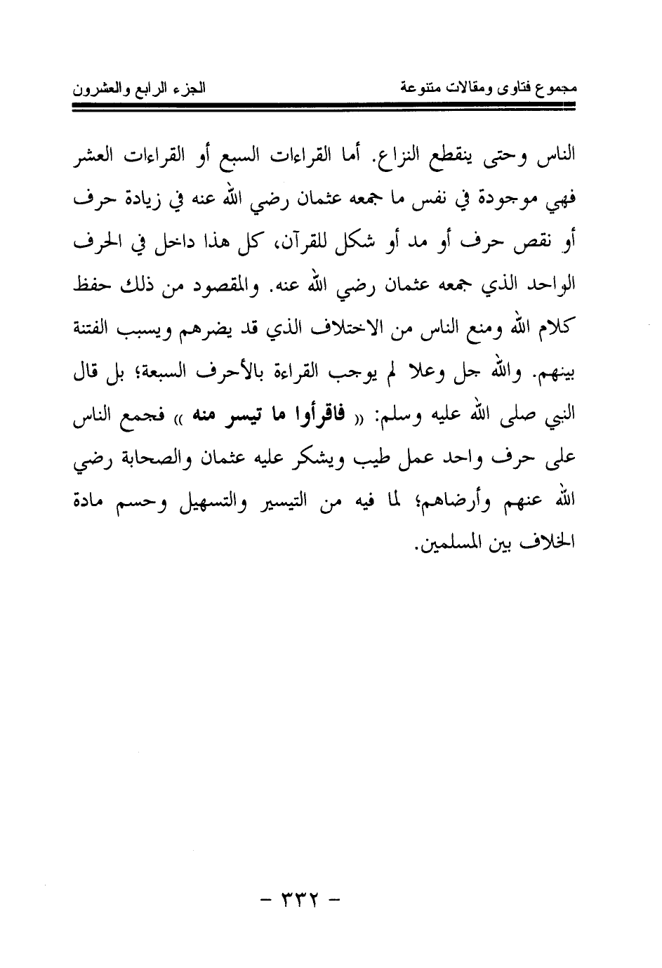 الناس وحتى ينقطع النزاع. أما القراءات السبع أو القراءات العشر فهي موجودة في نفس ما جمعه عثمان - رضي الله عنه - في زيادة حرف أو نقص حرف أو مد أو شكل للقرآن، كل هذا داخل في الحرف الواحد الذي جمعه عثمان - رضي الله عنه - والمقصود من ذلك حفظ كلام الله ومنع الناس من الاختلاف الذي قد يضرهم ويسبب الفتنة بينهم. والله جل وعلا لم يوجب القراءة بالأحرف السبعة؛ بل قال النبي - صلى الله عليه وسلم -: «فاقرءوا ما تيسر منه (¬1) » فجمع الناس على حرف واحد عمل طيب ويشكر عليه عثمان والصحابة - رضي الله عنهم وأرضاهم - لما فيه من التيسير والتسهيل وحسم مادة الخلاف بين المسلمين.