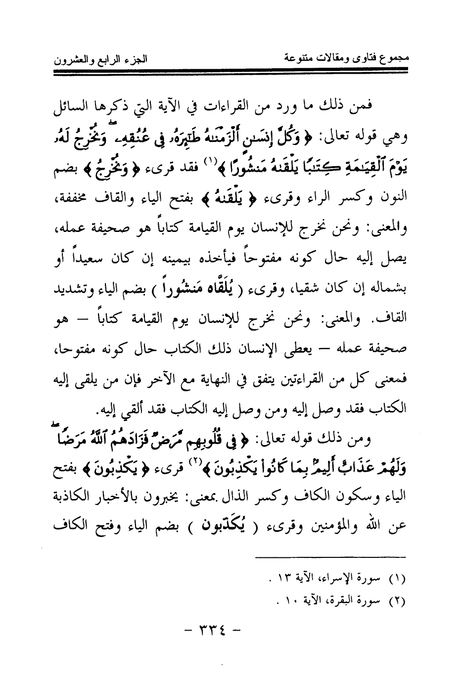 فمن ذلك ما ورد من القراءات في الآية التي ذكرها السائل، وهي قوله تعالى: {وَكُلَّ إِنْسَانٍ أَلْزَمْنَاهُ طَائِرَهُ فِي عُنُقِهِ وَنُخْرِجُ لَهُ يَوْمَ الْقِيَامَةِ كِتَابًا يَلْقَاهُ مَنْشُورًا} (¬1) فقد قرئ " ونخرج " بضم النون وكسر الراء، وقرئ " يلقاه " بفتح الياء والقاف مخففة، والمعنى: ونحن نخرج للإنسان يوم القيامة كتابا، هو صحيفة عمله، يصل إليه حال كونه مفتوحا فيأخذه بيمينه إن كان سعيدا، أو بشماله إن كان شقيا، وقرئ " يلقاه منشورا " بضم الياء وتشديد القاف. والمعنى: ونحن نخرج للإنسان يوم القيامة كتابا - هو صحيفة عمله - يعطى الإنسان ذلك الكتاب حال كونه مفتوحا، فمعنى كل من القراءتين يتفق في النهاية مع الآخر، فإن من يلقى إليه الكتاب فقد وصل إليه، ومن وصل إليه الكتاب فقد ألقي إليه.