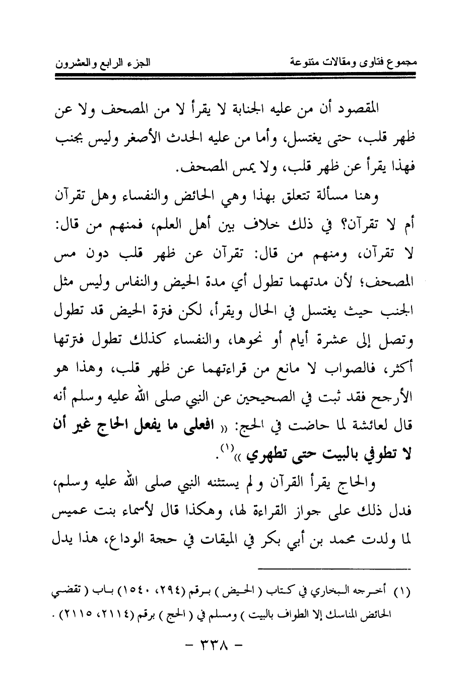 وهنا مسألة تتعلق بهذا وهي الحائض والنفساء وهل تقرآن أم لا تقرآن؟ في ذلك خلاف بين أهل العلم، فمنهم من قال: لا تقرآن، ومنهم من قال: تقرآن عن ظهر قلب دون مس المصحف؛ لأن مدتهما تطول أي مدة الحيض والنفاس وليس مثل الجنب حيث يغتسل في الحال ويقرأ، لكن فترة الحيض قد تطول وتصل إلى عشرة أيام أو نحوها، والنفساء كذلك تطول فترتها أكثر، فالصواب لا مانع من قراءتهما عن ظهر قلب، وهذا هو الأرجح فقد ثبت في الصحيحين عن النبي صلى الله عليه وسلم أنه قال لعائشة لما حاضت في الحج: «افعلي ما يفعل الحاج غير أن لا تطوفي بالبيت حتى تطهري (¬1) » .