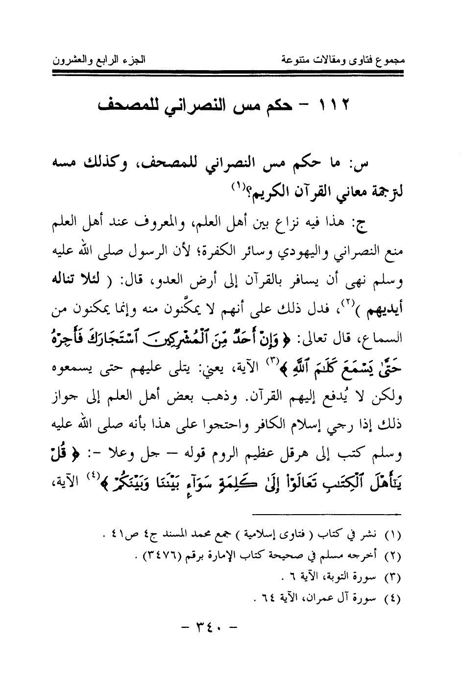 ج: هذا فيه نزاع بين أهل العلم، والمعروف عند أهل العلم منع النصراني واليهودي وسائر الكفرة؛ لأن الرسول صلى الله عليه وسلم نهى أن يسافر بالقرآن إلى أرض العدو، قال: «لئلا تناله أيديهم (¬2) » ، فدل ذلك على أنهم لا يمكنون منه وإنما يمكنون من السماع، قال تعالى: {وَإِنْ أَحَدٌ مِنَ الْمُشْرِكِينَ اسْتَجَارَكَ فَأَجِرْهُ حَتَّى يَسْمَعَ كَلَامَ اللَّهِ} (¬3) الآية، يعني: يتلى عليهم حتى يسمعوه ولكن لا يدفع إليهم القرآن. وذهب بعض أهل العلم إلى جواز ذلك إذا رجي إسلام الكافر واحتجوا على هذا بأنه صلى الله عليه وسلم كتب إلى هرقل عظيم الروم قوله- جل وعلا-: {قُلْ يَا أَهْلَ الْكِتَابِ تَعَالَوْا إِلَى كَلِمَةٍ سَوَاءٍ بَيْنَنَا وَبَيْنَكُمْ} (¬4) الآية،