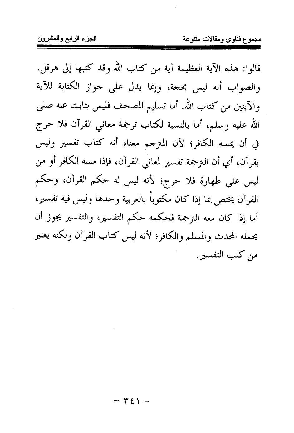 قالوا: هذه الآية العظيمة آية من كتاب الله وقد كتبها إلى هرقل. والصواب أنه ليس بحجة، وإنما يدل على جواز الكتابة للآية والآيتين من كتاب الله. أما تسليم المصحف فليس بثابت عنه صلى الله عليه وسلم، أما بالنسبة لكتاب ترجمة معاني القرآن فلا حرج في أن يمسه الكافر؛ لأن المترجم معناه أنه كتاب تفسير وليس بقرآن، أي أن الترجمة تفسير لمعاني القرآن، فإذا مسه الكافر أو من ليس على طهارة فلا حرج؛ لأنه ليس له حكم القرآن، وحكم القرآن يختص بما إذا كان مكتوبا بالعربية وحدها وليس فيه تفسير، أما إذا كان معه الترجمة فحكمه حكم التفسير، والتفسير يجوز أن يحمله المحدث والمسلم والكافر؛ لأنه ليس كتاب القرآن ولكنه يعتبر من كتب التفسير.